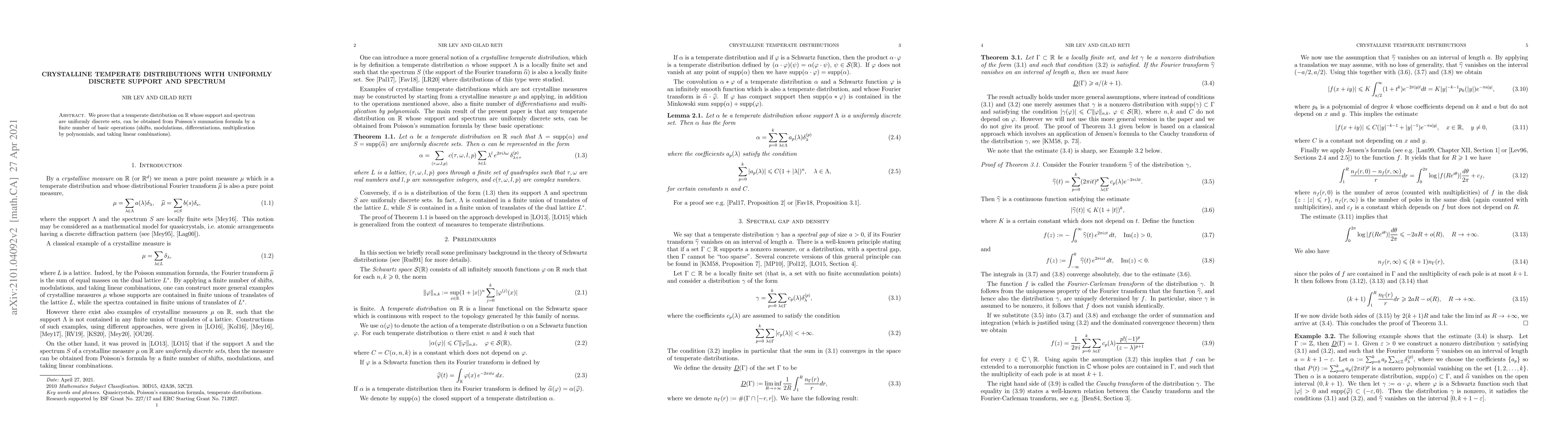 Summary: The paper proves that temperate distributions on $\mathbb{R}$ with uniformly discrete support and spectrum can be derived using Poisson's summation formula and a finite set of basic operations, including shifts, modulations, differentiations, and polynomial multiplications.