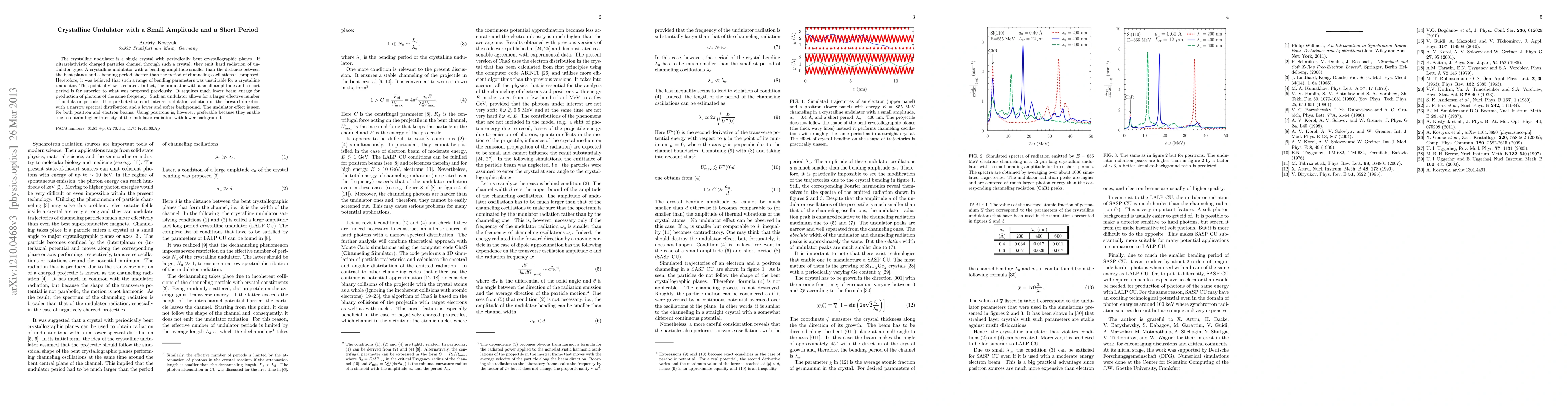 The crystalline undulator is a single crystal with periodically bent crystallographic planes. If ultrarelativistic charged particles channel through such a crystal, they emit hard radiation of undulator type. A crystalline undulator with a bending amplitude smaller than the distance between the bent planes and a bending period shorter than the period of channeling oscillations is proposed. Heretofore, it was believed that such a range of bending parameters was unsuitable for a crystalline undulator. This point of view is refuted. In fact, the undulator with a small amplitude and a short period is far superior to what was proposed previously. It requires much lower beam energy for production of photons of the same frequency. Such an undulator allows for a larger effective number of undulator periods. It is predicted to emit intense undulator radiation in the forward direction with a narrow spectral distribution and a lower and softer background. The undulator effect is seen for both positron and electron beams. Using positrons is, however, preferable because they enable one to obtain higher intensity of the undulator radiation with lower background.