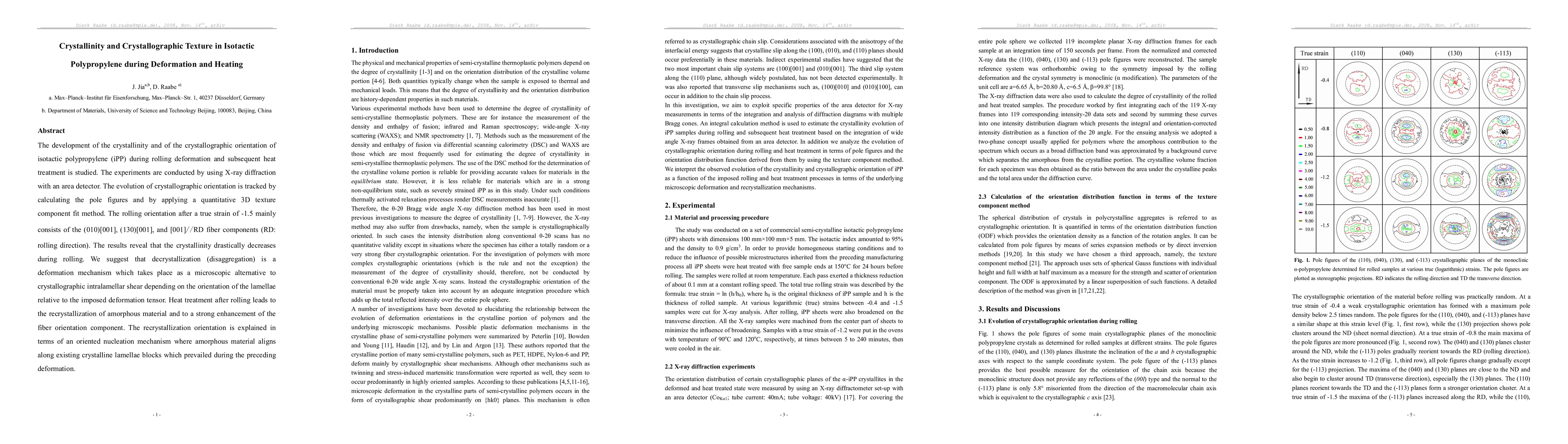 The development of the crystallinity and of the crystallographic orientation of isotactic polypropylene (iPP) during rolling deformation and subsequent heat treatment is studied. The experiments are conducted by using X-ray diffraction with an area detector. The evolution of crystallographic orientation is tracked by calculating the pole figures and by applying a quantitative 3D texture component fit method. The rolling orientation after a true strain of -1.5 mainly consists of the (010)[001], (130)[001], and [001]//RD fiber components (RD: rolling direction). The results reveal that the crystallinity drastically decreases during rolling. We suggest that decrystallization (disaggregation) is a deformation mechanism which takes place as a microscopic alternative to crystallographic intralamellar shear depending on the orientation of the lamellae relative to the imposed deformation tensor. Heat treatment after rolling leads to the recrystallization of amorphous material and to a strong enhancement of the fiber orientation component. The recrystallization orientation is explained in terms of an oriented nucleation mechanism where amorphous material aligns along existing crystalline lamellae blocks which prevailed during the preceding deformation.