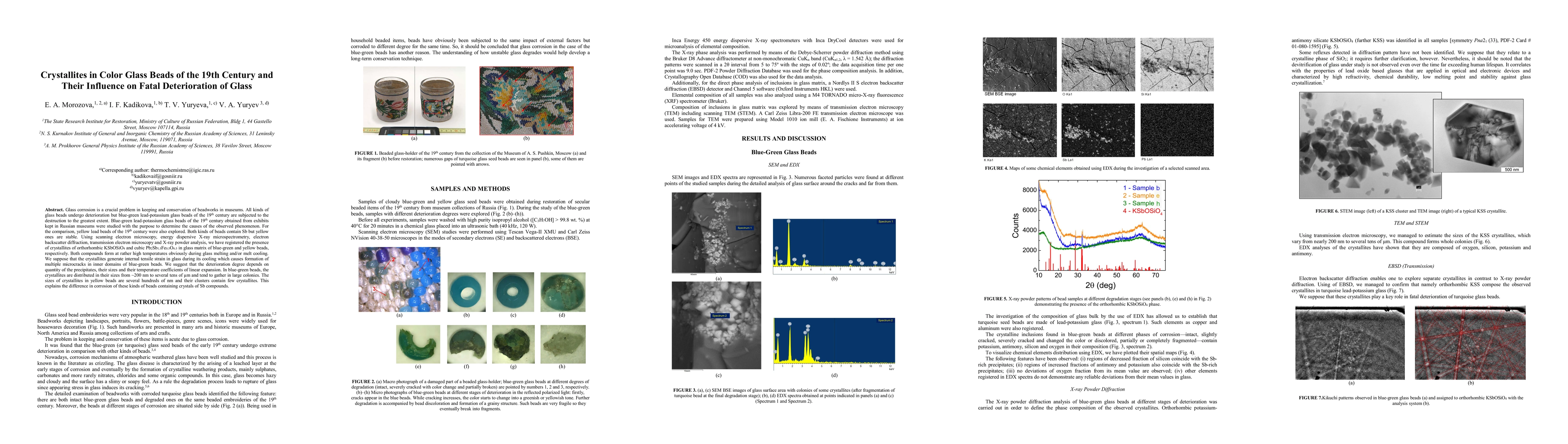 Glass corrosion is a crucial problem in keeping and conservation of beadworks in museums. All kinds of glass beads undergo deterioration but blue-green lead-potassium glass beads of the 19th century are subjected to the destruction to the greatest extent. Blue-green lead-potassium glass beads of the 19th century obtained from exhibits kept in Russian museums were studied with the purpose to determine the causes of the observed phenomenon. For the comparison, yellow lead beads of the 19th century were also explored. Both kinds of beads contain Sb but yellow ones are stable. Using scanning electron microscopy, energy dispersive X-ray microspectrometry, electron backscatter diffraction, transmission electron microscopy and X-ray powder analysis, we have registered the presence of crystallites of orthorhombic KSbOSiO$_4$ and cubic Pb$_2$Sb$_{1.5}$Fe$_{0.5}$O$_{6.5}$ in glass matrix of blue-green and yellow beads, respectively. Both compounds form at rather high temperatures obviously during glass melting and/or melt cooling. We suppose that the crystallites generate internal tensile strain in glass during its cooling which causes formation of multiple microcracks in inner domains of blue-green beads. We suggest that the deterioration degree depends on quantity of the precipitates, their sizes and their temperature coefficients of linear expansion. In blue-green beads, the crystallites are distributed in their sizes from $\sim\,$200 nm to several tens of $\mu$m and tend to gather in large colonies. The sizes of crystallites in yellow beads are several hundreds of nm and their clusters contain few crystallites. This explains the difference in corrosion of these kinds of beads containing crystals of Sb compounds.