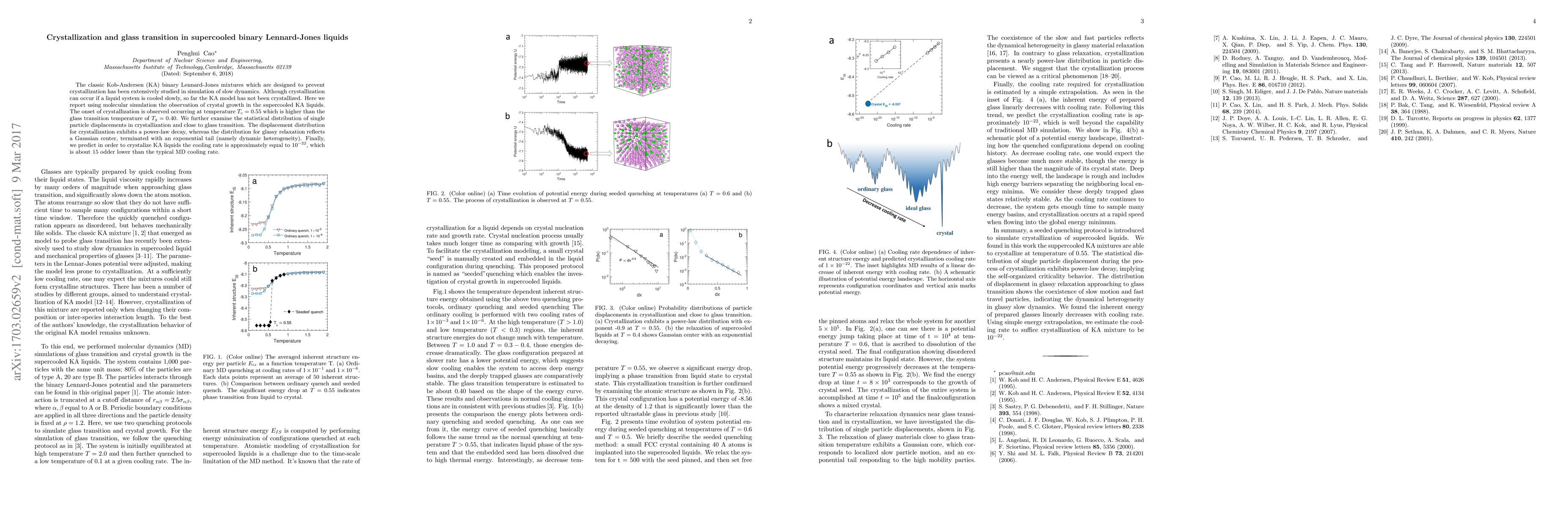 The classic Kob-Andersen (KA) binary Lennard-Jones mixtures which are designed to prevent crystallization has been extensively studied in simulation of slow dynamics. Although crystallization can occur if a liquid system is cooled slowly, so far the KA model has not been crystallized. Here we report using molecular simulation the observation of crystal growth in the supercooled KA liquids. The onset of crystallization is observed occurring at temperature $T_c= 0.55$ which is higher than the glass transition temperature of $T_g=0.40$. We further examine the statistical distribution of single particle displacements in crystallization and close to glass transition. The displacement distribution for crystallization exhibits a power-law decay, whereas the distribution for glassy relaxation reflects a Gaussian center, terminated with an exponential tail (namely dynamic heterogeneity). Finally, we predict in order to crystalize KA liquids the cooling rate is approximately equal to $10^{-22}$, which is about 15 odder lower than the typical MD cooling rate.