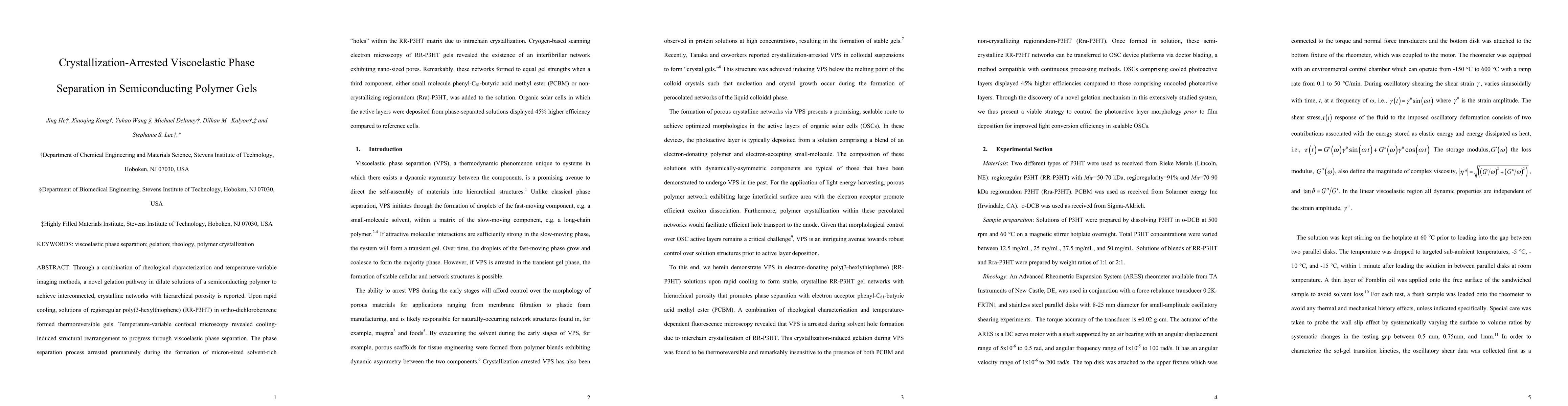 This paper reports a novel gelation pathway in semiconducting polymer solutions that leads to interconnected, crystalline networks with hierarchical porosity, achieved through crystallization-arrested viscoelastic phase separation. The addition of a third component enhances gel strength and improves organic solar cell efficiency by 45%.