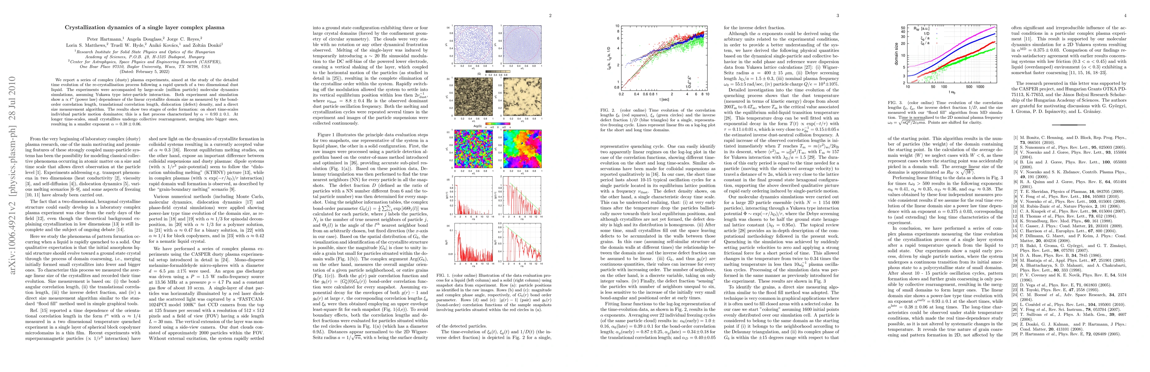 We report a series of complex (dusty) plasma experiments, aimed at the study of the detailed time evolution of the re-crystallisation process following a rapid quench of a two dimensional dust liquid. The experiments were accompanied by large-scale (million particle) molecular dynamics simulations, assuming Yukawa type inter-particle interaction. Both experiment and simulation show a $\propto t^\alpha$ (power law) dependence of the linear crystallite domain size as measured by the bond-order correlation length, translational correlation length, dislocation (defect) density, and a direct size measurement algorithm. The results show two stages of order formation: on short time-scales individual particle motion dominates; this is a fast process characterized by $\alpha=0.93\pm0.1$. At longer time-scales, small crystallites undergo collective rearrangement, merging into bigger ones, resulting in a smaller exponent $\alpha=0.38\pm0.06$.