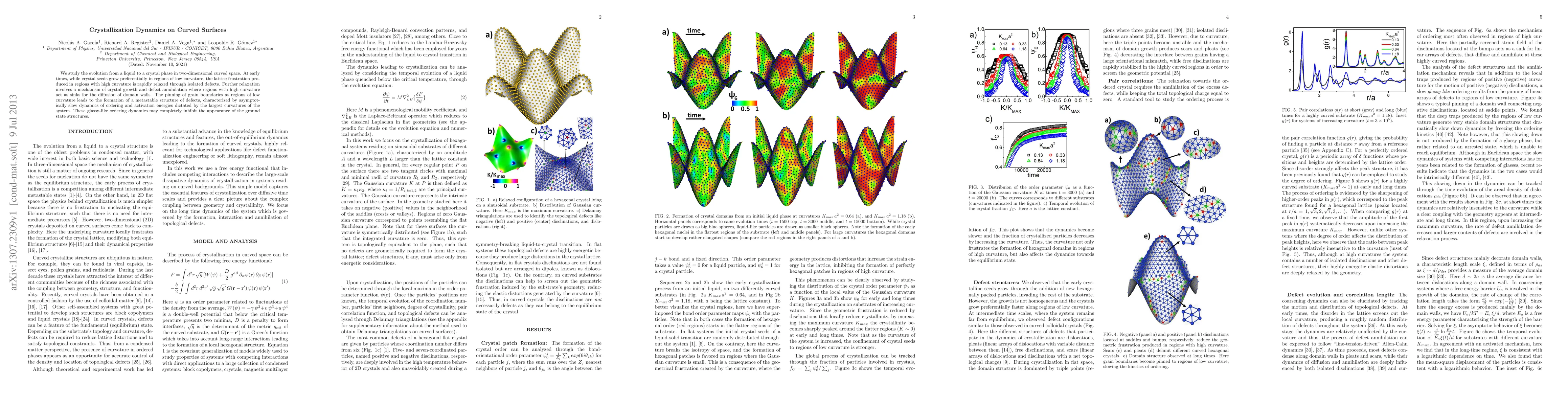 Researchers study how crystals form on curved surfaces, finding that regions of high curvature can slow down crystal growth and create glass-like ordering dynamics. This can lead to the formation of metastable structures with slow dynamics.