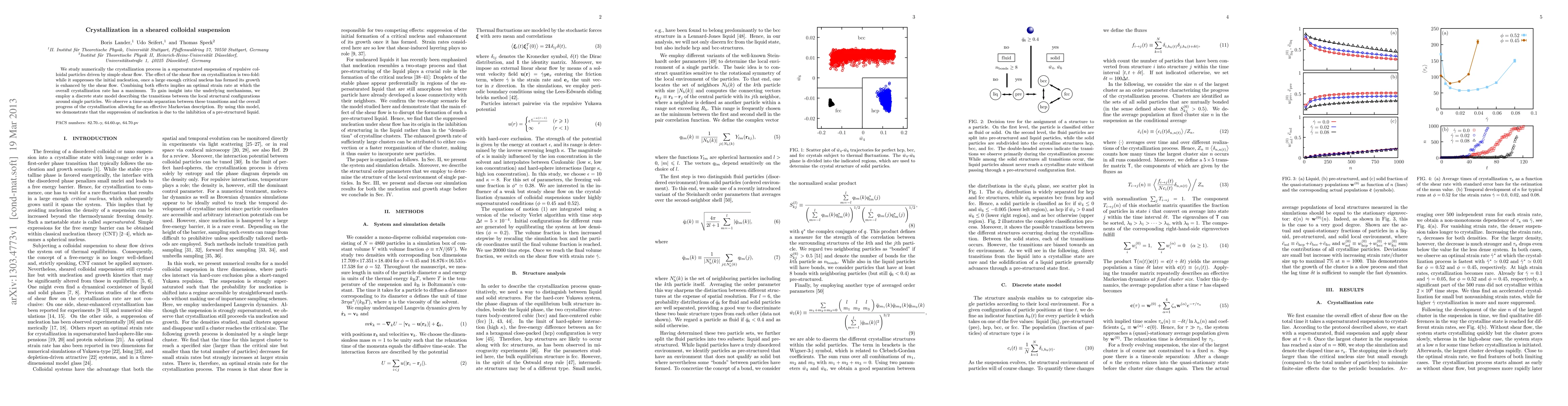 This paper investigates numerically the crystallization dynamics in a supersaturated colloidal suspension under shear flow, revealing that shear suppresses initial nucleation but enhances crystal growth once a critical nucleus forms, leading to an optimal strain rate for maximum crystallization rate. The study employs a discrete state model to show that the inhibition of nucleation is due to the suppression of a pre-structured liquid phase.