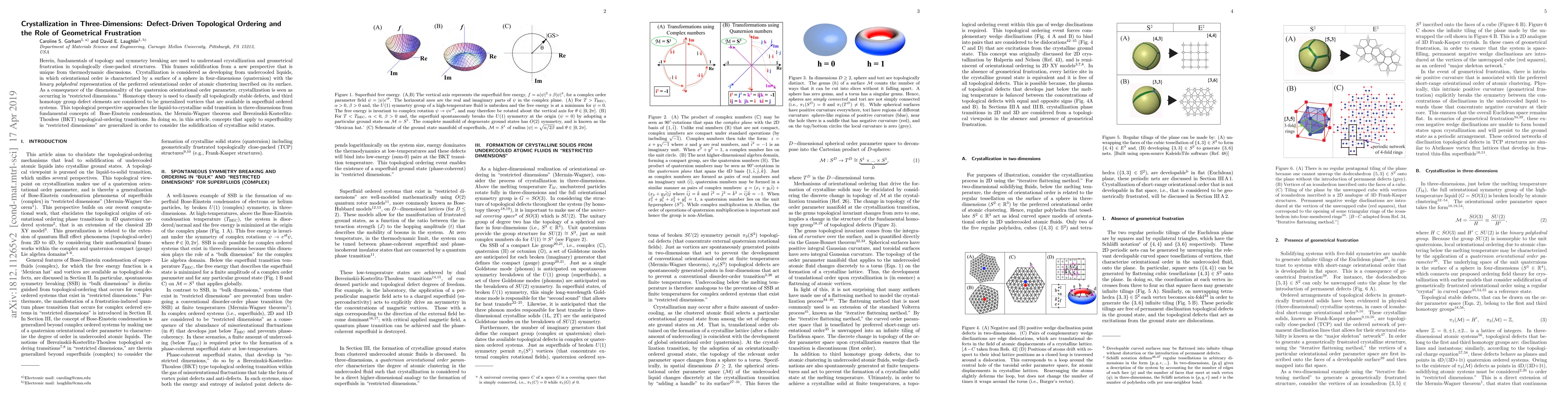 Herein, fundamentals of topology and symmetry breaking are used to understand crystallization and geometrical frustration in topologically close-packed structures. This frames solidification from a new perspective that is unique from thermodynamic discussions. Crystallization is considered as developing from undercooled liquids, in which orientational order is characterized by a surface of a sphere in four-dimensions (quaternion) with the binary polyhedral representation of the preferred orientational order of atomic clustering inscribed on its surface. As a consequence of the dimensionality of the quaternion orientational order parameter, crystallization is seen as occurring in "restricted dimensions." Homotopy theory is used to classify all topologically stable defects, and third homotopy group defect elements are considered to be generalized vortices that are available in superfluid ordered systems. This topological perspective approaches the liquid-to-crystalline solid transition in three-dimensions from fundamental concepts of: Bose-Einstein condensation, the Mermin-Wagner theorem and Berezinskii-Kosterlitz-Thouless (BKT) topological-ordering transitions. In doing so, in this article, concepts that apply to superfluidity in "restricted dimensions" are generalized in order to consider the solidification of crystalline solid states.