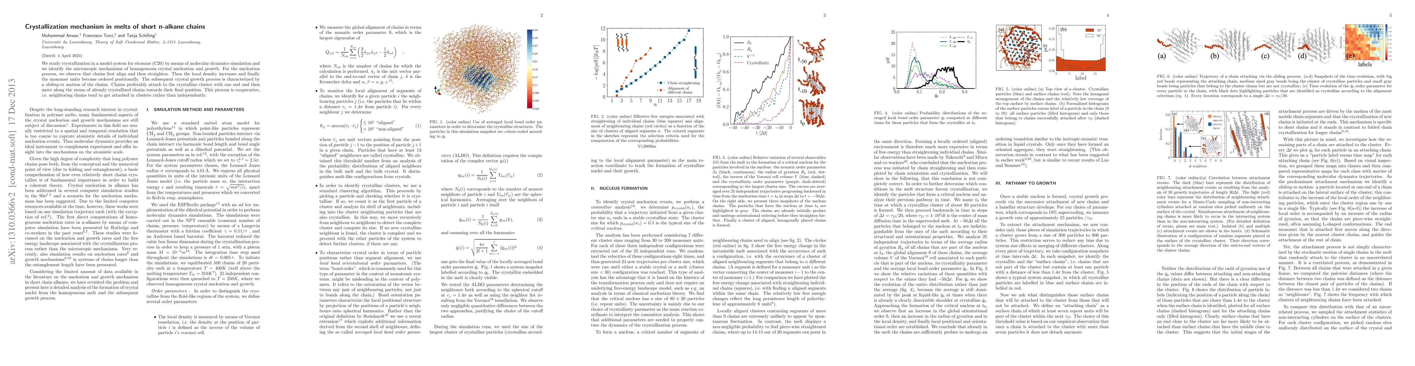 Researchers studied crystallization in eicosane using molecular dynamics simulation, finding that chains first align, then straighten, and finally order positionally before growing through a sliding-in motion of attached chains.