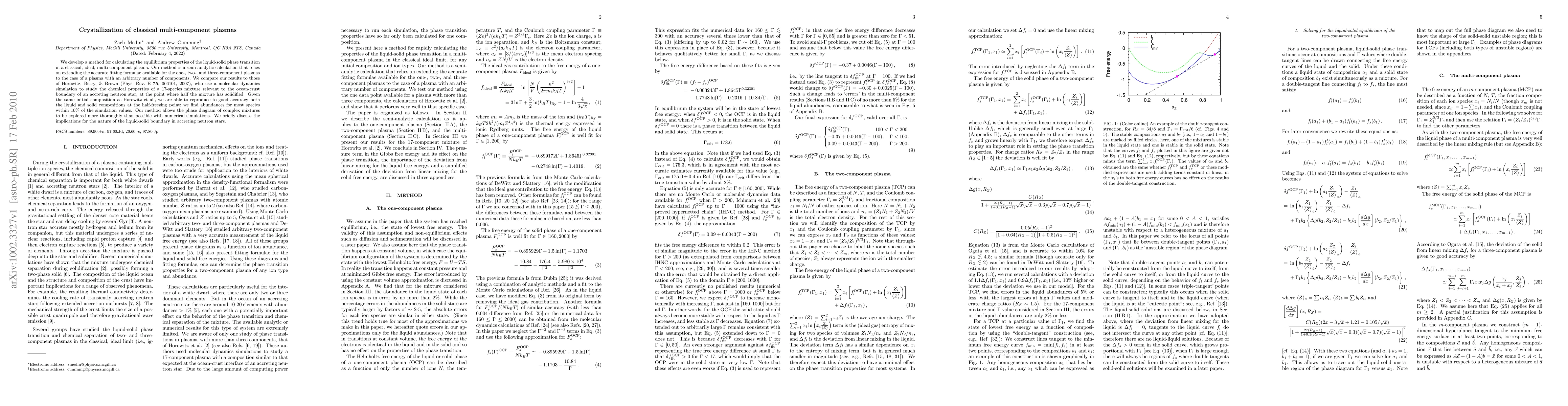 Researchers developed a method to calculate the equilibrium properties of liquid-solid phase transitions in multi-component plasmas, accurately reproducing results from molecular dynamics simulations for certain mixtures.