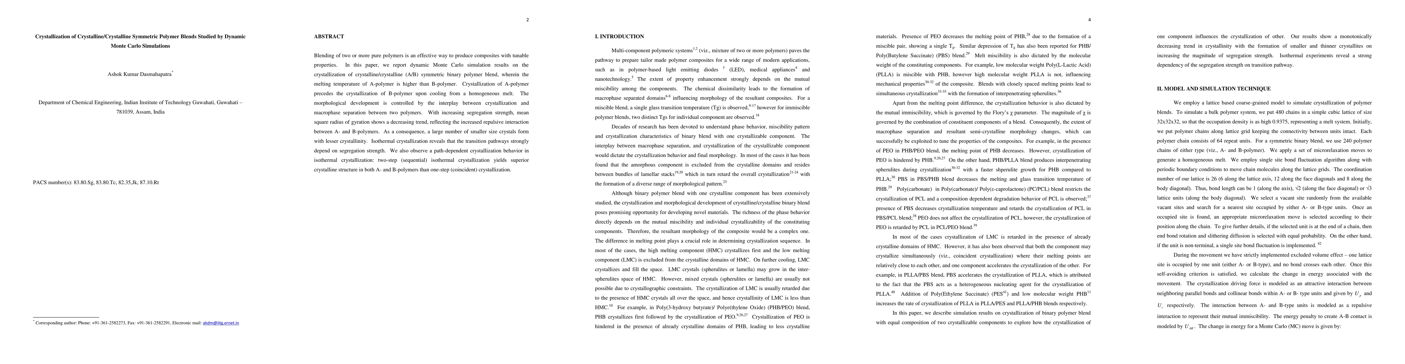 This paper uses dynamic Monte Carlo simulations to study the crystallization behavior of crystalline/crystalline symmetric polymer blends, finding that A-polymer crystallizes first, followed by B-polymer, with smaller and thinner crystals forming as segregation strength increases, leading to a path-dependent crystallization behavior.