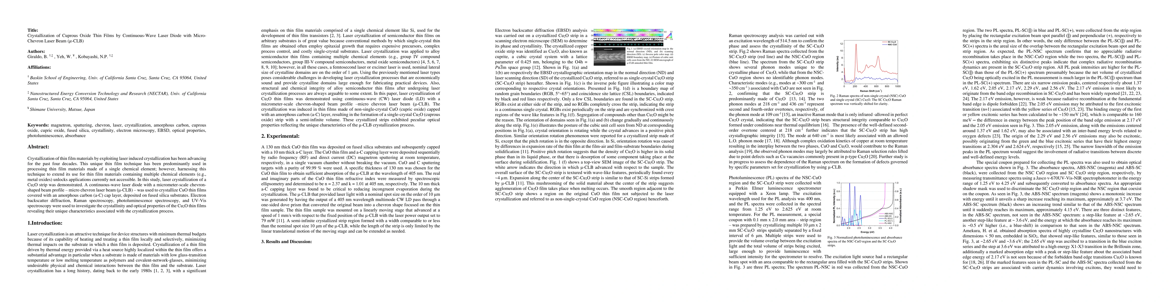 This study demonstrates the crystallization of Cu2O thin films using a continuous-wave laser diode with a micro-chevron laser beam, revealing their crystallinity and unique optical properties through various spectroscopic analyses. The technique shows potential for expanding laser-induced crystallization to multi-element materials like metal oxides.