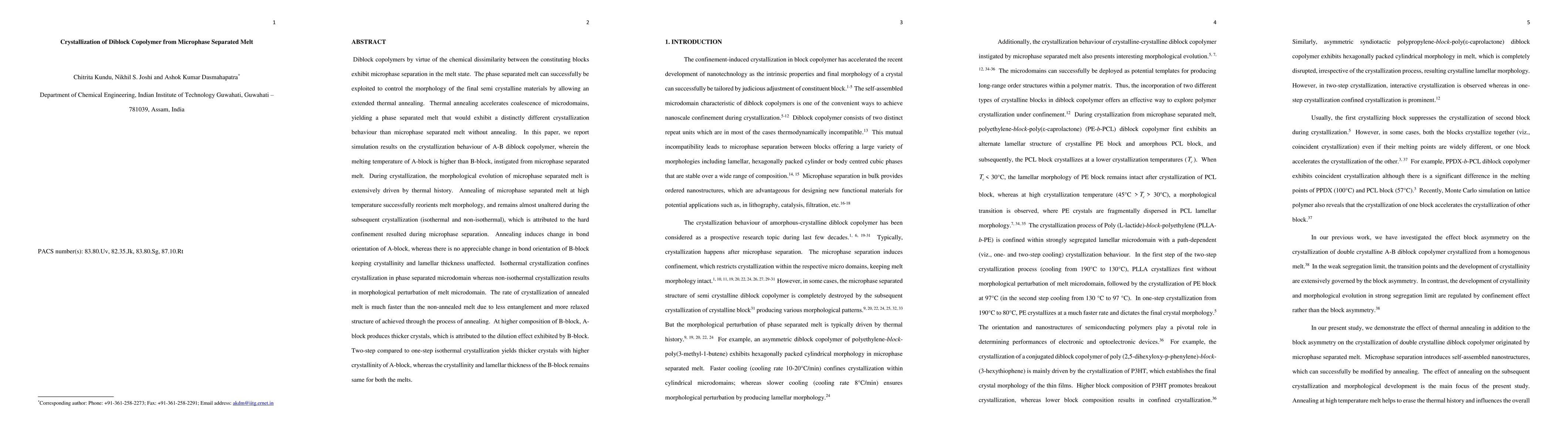 This paper investigates the crystallization behavior of A-B diblock copolymers from microphase separated melts, showing that thermal annealing reorients the melt morphology, leading to faster crystallization rates and thicker crystals due to reduced entanglement and confinement effects. The annealing process alters the bond orientation of the A-block without affecting the B-block, resulting in distinct crystallization behaviors.