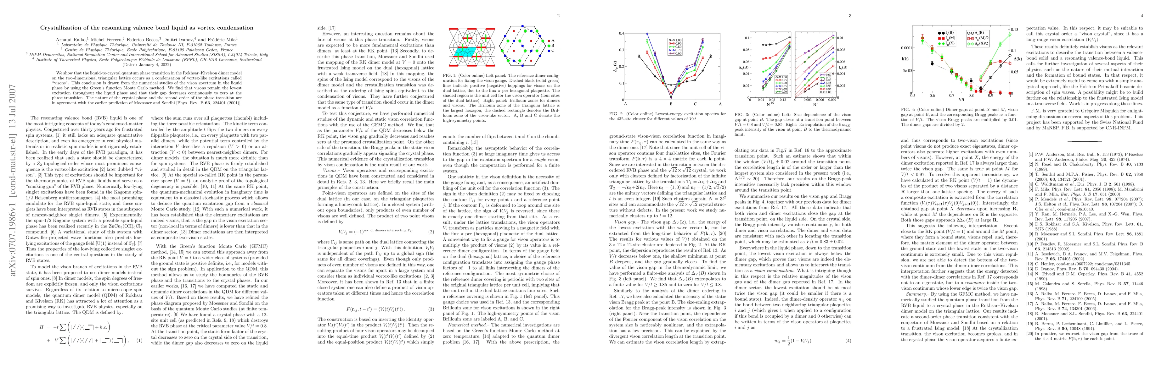 We show that the liquid-to-crystal quantum phase transition in the Rokhsar--Kivelson dimer model on the two-dimensional triangular lattice occurs as a condensation of vortex-like excitations called ``visons''. This conclusion is drawn from the numerical studies of the vison spectrum in the liquid phase by using the Green's function Monte Carlo method. We find that visons remain the lowest excitation throughout the liquid phase and that their gap decreases continuously to zero at the phase transition. The nature of the crystal phase and the second order of the phase transition are in agreement with the earlier prediction of Moessner and Sondhi [Phys. Rev. B 63, 224401 (2001)].