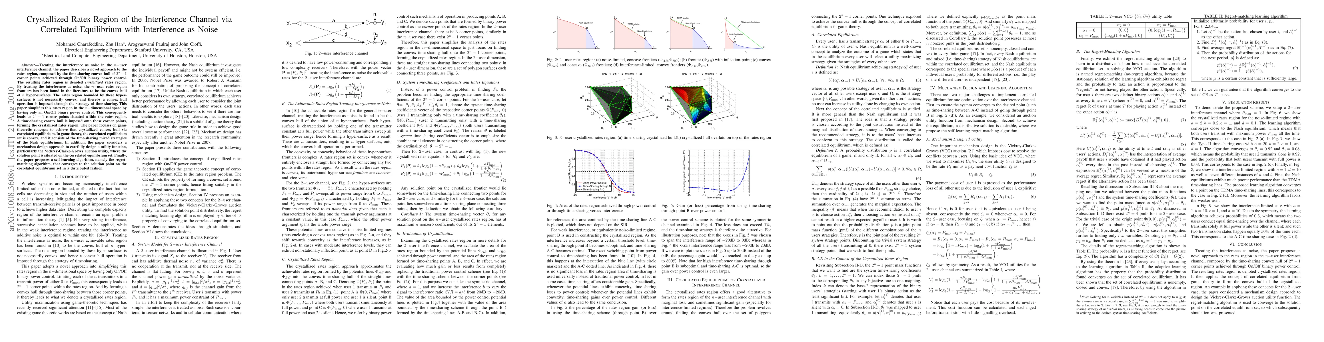 Treating the interference as noise in the n-user interference channel, the paper describes a novel approach to the rates region, composed by the time-sharing convex hull of 2^n-1 corner points achieved through On/Off binary power control. The resulting rates region is denoted crystallized rates region. By treating the interference as noise, the n-user rates region frontiers has been found in the literature to be the convex hull of n hyper-surfaces. The rates region bounded by these hyper-surfaces is not necessarily convex, and thereby a convex hull operation is imposed through the strategy of time-sharing. This paper simplifies this rates region in the n-dimensional space by having only an On/Off binary power control. This consequently leads to 2^n-1 corner points situated within the rates region. A time-sharing convex hull is imposed onto those corner points, forming the crystallized rates region. The paper focuses on game theoretic concepts to achieve that crystallized convex hull via correlated equilibrium. In game theory, the correlated equilibrium set is convex, and it consists of the time-sharing mixed strategies of the Nash equilibriums. In addition, the paper considers a mechanism design approach to carefully design a utility function, particularly the Vickrey-Clarke-Groves auction utility, where the solution point is situated on the correlated equilibrium set. Finally, the paper proposes a self learning algorithm, namely the regret-matching algorithm, that converges to the solution point on the correlated equilibrium set in a distributed fashion.