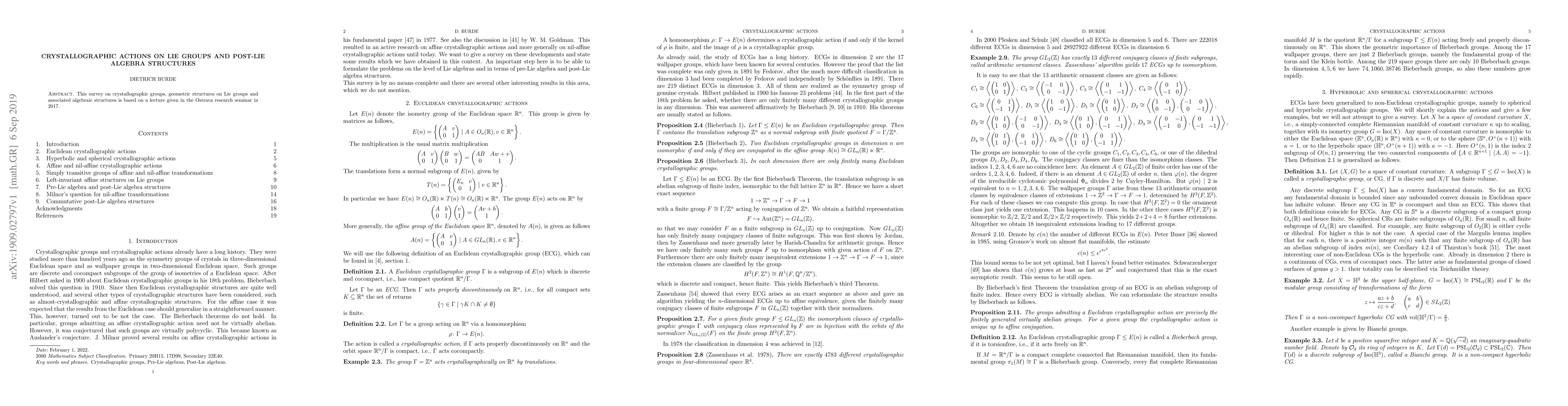 The study provides a comprehensive overview of crystallographic groups, geometric structures on Lie groups, and associated algebraic structures, contributing to the understanding of crystallographic actions and their implications in algebra and geometry.