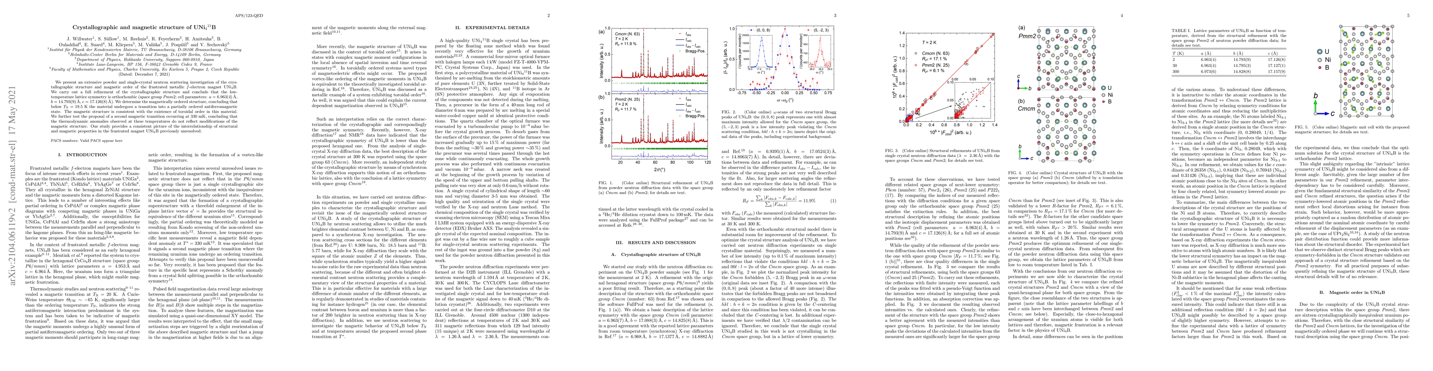 We present an extensive powder and single-crystal neutron scattering investigation of the crystallographic structure and magnetic order of the frustrated metallic $f$-electron magnet UNi$_4$B. We carry out a full refinement of the crystallographic structure and conclude that the low-temperature lattice symmetry is orthorhombic (space group Pmm2; cell parameters: $a = 6.963(4)~\r{A}$ , $b = 14.793(9)~\r{A}$ , $c = 17.126(8)~\r{A}$). We determine the magnetically ordered structure, concluding that below $T_\mathrm{N} = 19.5~\mathrm{K}$ the material undergoes a transition into a partially ordered antiferromagnetic state. The magnetic structure is consistent with the existence of toroidal order in this material. We further test the proposal of a second magnetic transition occurring at $330~\mathrm{mK}$, concluding that the thermodynamic anomalies observed at these temperatures do not reflect modifications of the magnetic structure. Our study provides a consistent picture of the interrelationship of structural and magnetic properties in the frustrated magnet UNi$_4$B previously unresolved.