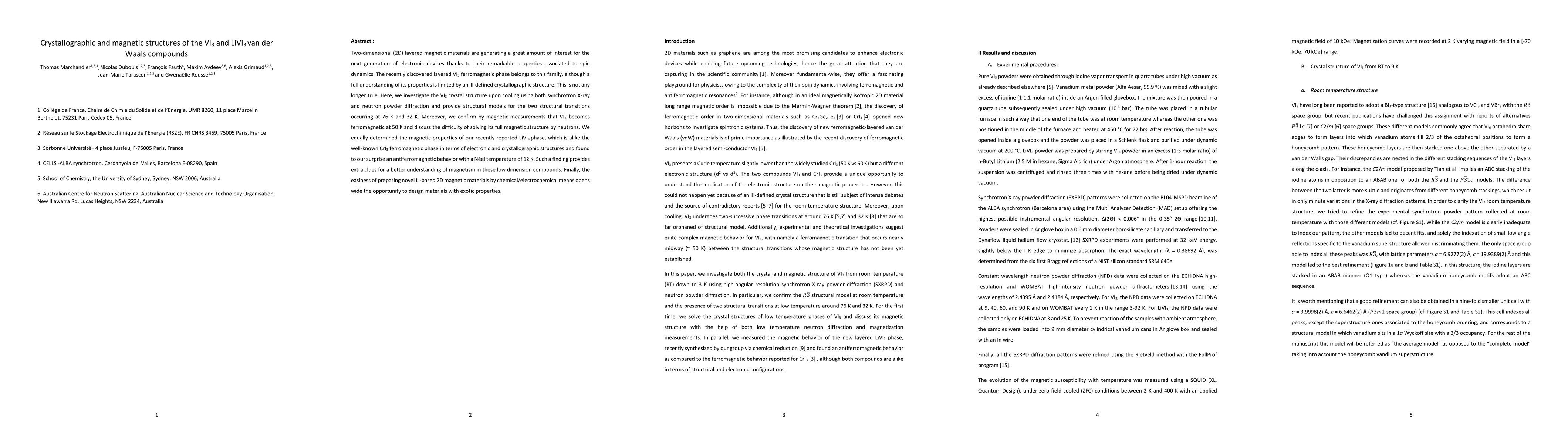 Two-dimensional (2D) layered magnetic materials are generating a great amount of interest for the next generation of electronic devices thanks to their remarkable properties associated to spin dynamics. The recently discovered layered VI$_3$ ferromagnetic phase belongs to this family, although a full understanding of its properties is limited by an ill-defined crystallographic structure. This is not any longer true. Here, we investigate the VI$_3$ crystal structure upon cooling using both synchrotron X-ray and neutron powder diffraction and provide structural models for the two structural transitions occurring at 76 K and 32 K. Moreover, we confirm by magnetic measurements that VI$_3$ becomes ferromagnetic at 50 K and discuss the difficulty of solving its full magnetic structure by neutrons. We equally determined the magnetic properties of our recently reported LiVI$_3$ phase, which is alike the well-known CrI$_3$ ferromagnetic phase in terms of electronic and crystallographic structures and found to our surprise an antiferromagnetic behavior with a N\'eel temperature of 12 K. Such a finding provides extra clues for a better understanding of magnetism in these low dimension compounds. Finally, the easiness of preparing novel Li-based 2D magnetic materials by chemical/electrochemical means opens wide the opportunity to design materials with exotic properties.