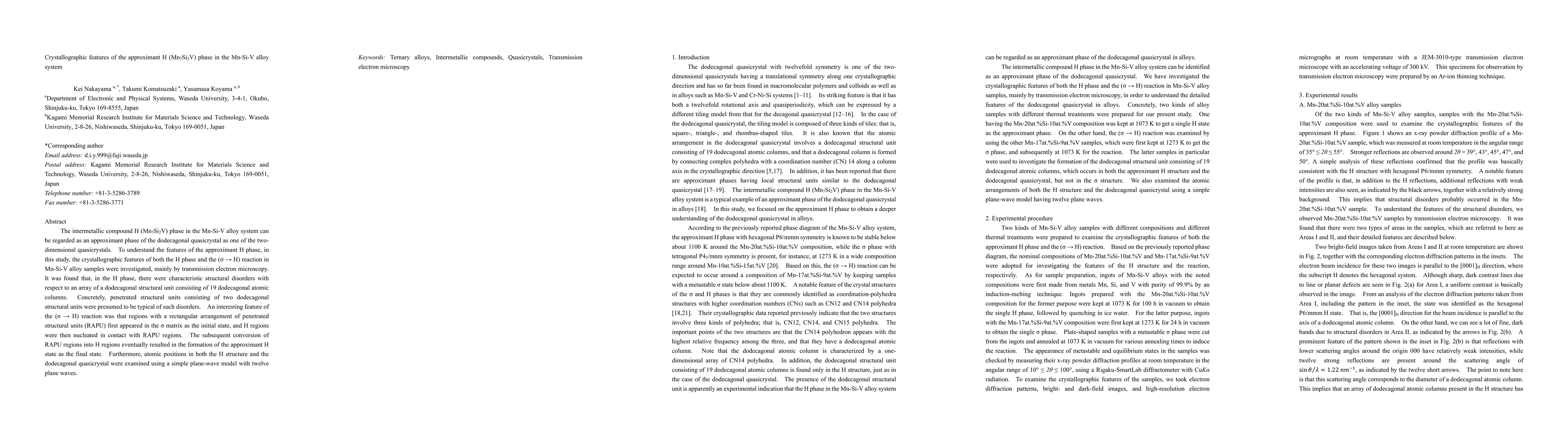 The intermetallic compound H (Mn$_7$Si$_2$V) phase in the Mn-Si-V alloy system can be regarded as an approximant phase of the dodecagonal quasicrystal as one of the two-dimensional quasicrystals. To understand the features of the approximant H phase, in this study, the crystallographic features of both the H phase and the (\sigma $\, \rightarrow$ H) reaction in Mn-Si-V alloy samples were investigated, mainly by transmission electron microscopy. It was found that, in the H phase, there were characteristic structural disorders with respect to an array of a dodecagonal structural unit consisting of 19 dodecagonal atomic columns. Concretely, penetrated structural units consisting of two dodecagonal structural units were presumed to be typical of such disorders. An interesting feature of the (\sigma $\, \rightarrow$ H) reaction was that regions with a rectangular arrangement of penetrated structural units (RAPU) first appeared in the \sigma $\,$ matrix as the initial state, and H regions were then nucleated in contact with RAPU regions. The subsequent conversion of RAPU regions into H regions eventually resulted in the formation of the approximant H state as the final state. Furthermore, atomic positions in both the H structure and the dodecagonal quasicrystal were examined using a simple plane-wave model with twelve plane waves.