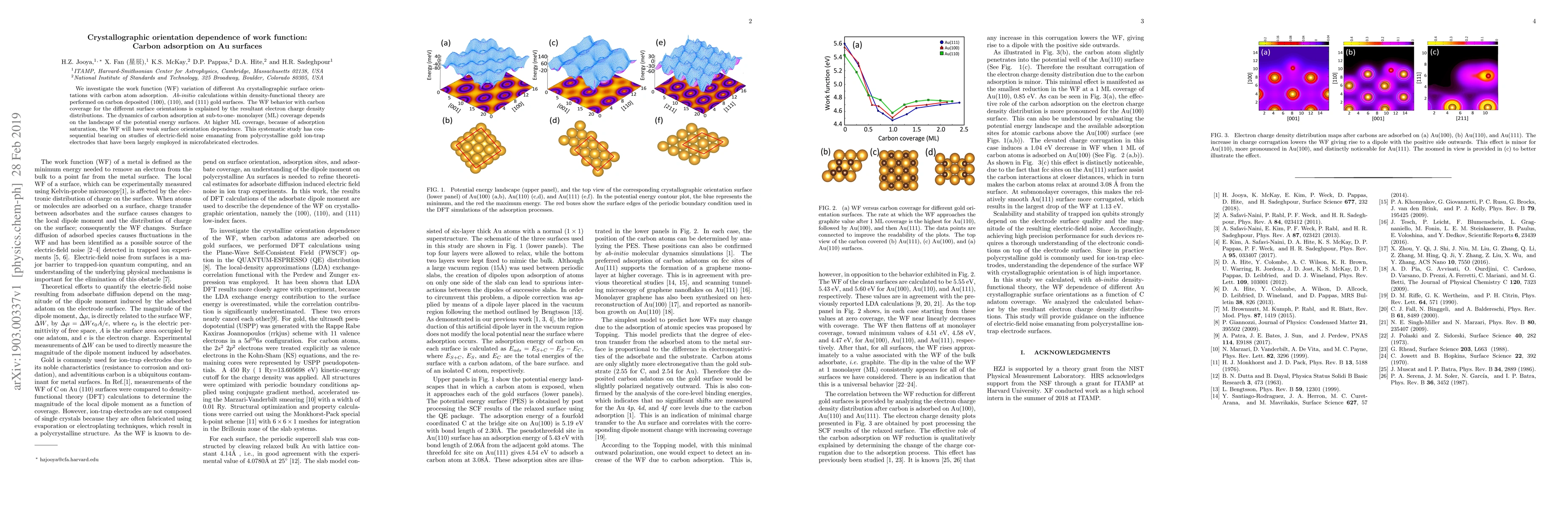 This study uses ab-initio calculations to examine how carbon adsorption affects the work function of different Au crystallographic surfaces (100), (110), and (111). The work function variation is explained by electron charge density distributions, with dynamics dependent on potential energy surfaces at sub-monolayer coverages, and weak orientation dependence at higher coverages due to saturation.