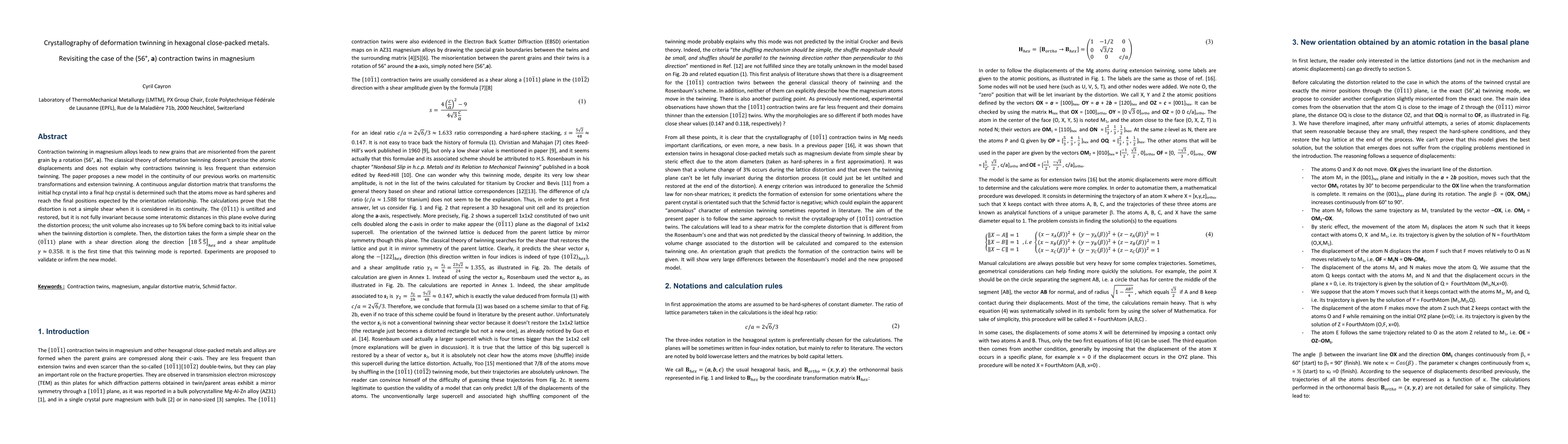 This paper proposes a new model for (56 deg, a) contraction twinning in magnesium, explaining atomic displacements and the rarity of contraction twinning. It introduces a continuous angular distortion that transforms the initial hcp crystal structure, revealing a complex shear mechanism distinct from simple shear.