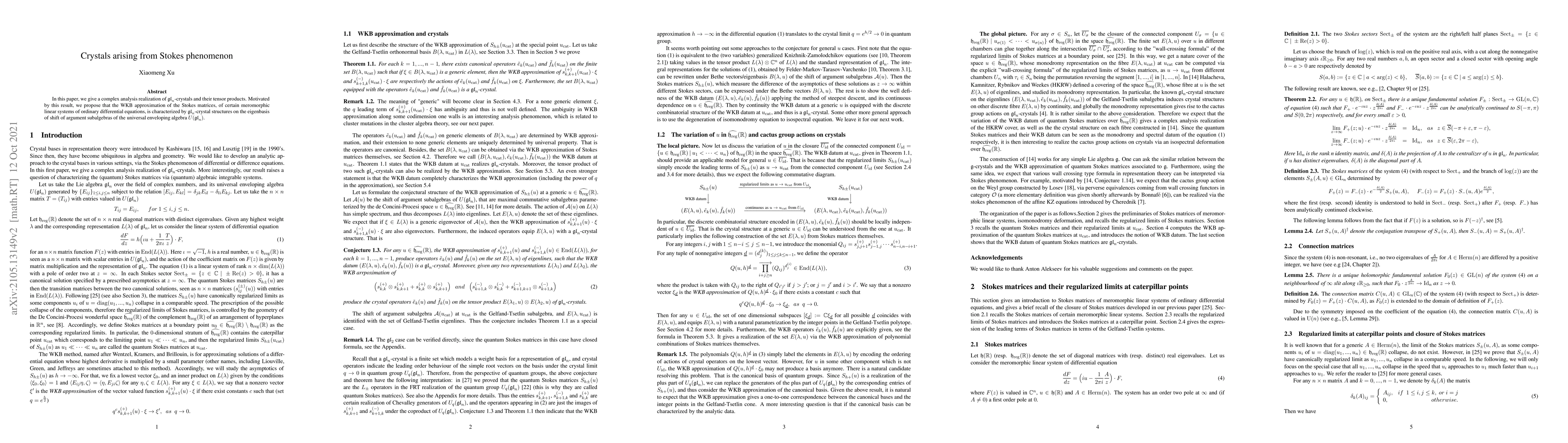 In this paper, we give a complex analysis realization of $\frak{gl}_n$-crystals and their tensor products. Motivated by this, we propose that the WKB approximation of the Stokes matrices, of certain meromorphic linear systems of ordinary differential equations, is characterized by $\frak{gl}_n$-crystal structures on the eigenbasis of shift of argument subalgebras of the universal enveloping algebra $U({\frak {gl}}_n)$.