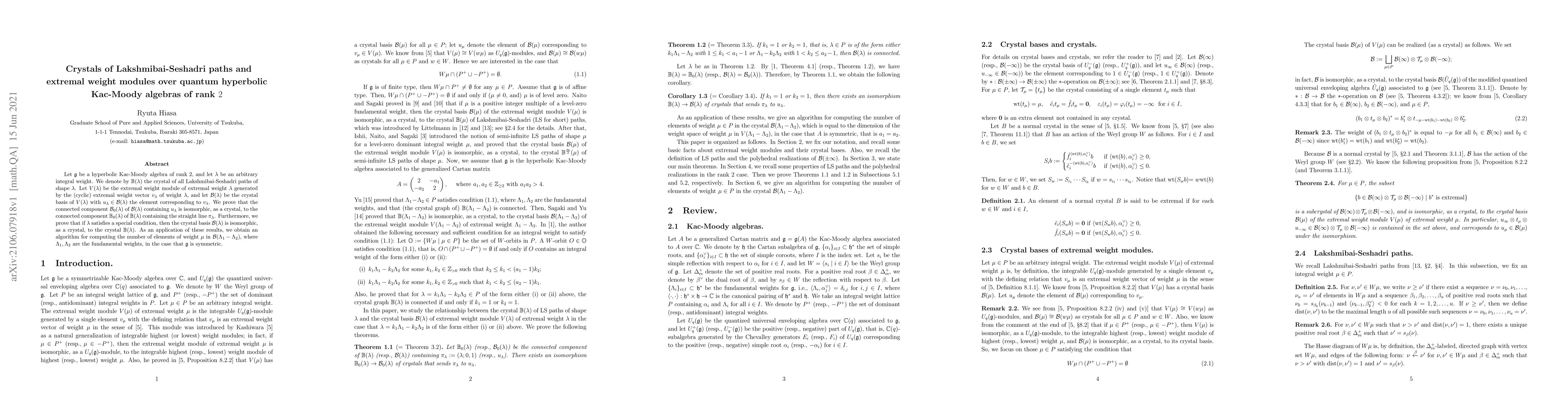 The paper studies crystals of Lakshmibai-Seshadri paths and extremal weight modules over hyperbolic Kac-Moody algebras of rank 2, showing isomorphisms between crystal bases and providing an algorithm to compute the number of elements of a certain weight.
