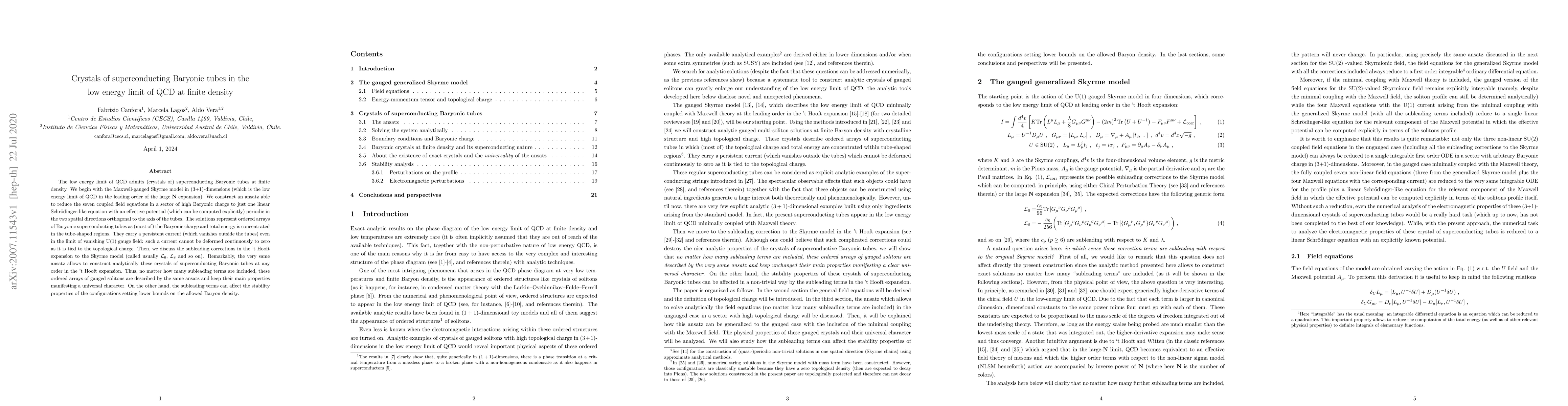 The low energy limit of QCD admits (crystals of) superconducting Baryonic tubes at finite density. We begin with the Maxwell-gauged Skyrme model in (3+1)-dimensions (which is the low energy limit of QCD in the leading order of the large N expansion). We construct an ansatz able to reduce the seven coupled field equations in a sector of high Baryonic charge to just one linear Schrodinger-like equation with an effective potential (which can be computed explicitly) periodic in the two spatial directions orthogonal to the axis of the tubes. The solutions represent ordered arrays of Baryonic superconducting tubes as (most of) the Baryonic charge and total energy is concentrated in the tube-shaped regions. They carry a persistent current (which vanishes outside the tubes) even in the limit of vanishing U(1) gauge field: such a current cannot be deformed continuously to zero as it is tied to the topological charge. Then, we discuss the subleading corrections in the 't Hooft expansion to the Skyrme model (called usually \mathcal{L}_{6}$, $\mathcal{L}_{8}$ and so on). Remarkably, the very same ansatz allows to construct analytically these crystals of superconducting Baryonic tubes at any order in the 't Hooft expansion. Thus, no matter how many subleading terms are included, these ordered arrays of gauged solitons are described by the same ansatz and keep their main properties manifesting a universal character. On the other hand, the subleading terms can affect the stability properties of the configurations setting lower bounds on the allowed Baryon density.