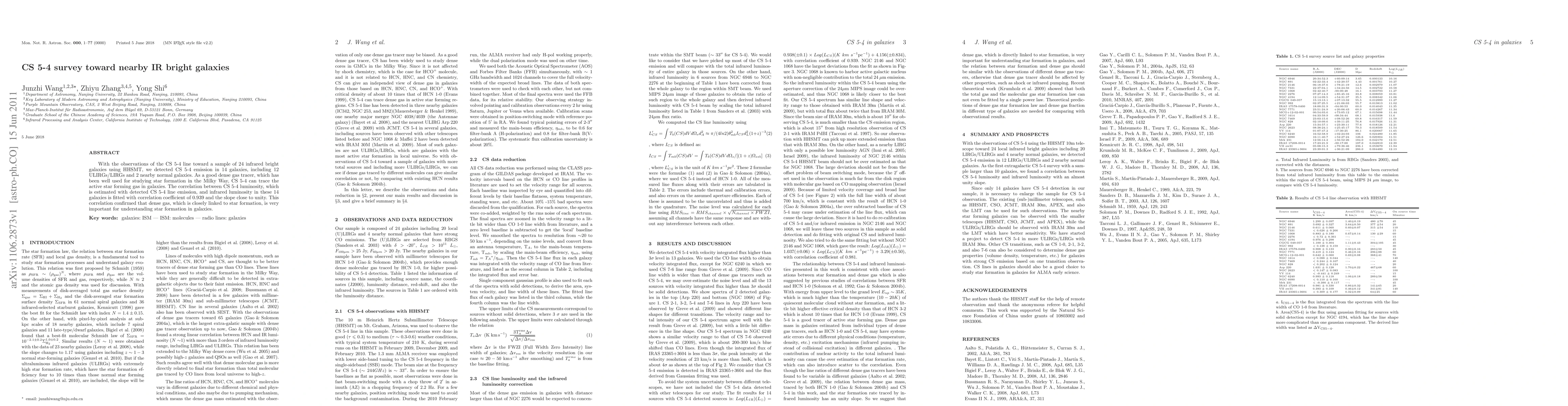 With the observations of the CS 5-4 line toward a sample of 24 infrared bright galaxies using HHSMT, we detected CS 5-4 emission in 14 galaxies, including 12 ULIRGs/LIRGs and 2 nearby normal galaxies. As a good dense gas tracer, which has been well used for studying star formation in the Milky Way, CS 5-4 can trace the active star forming gas in galaxies. The correlation between CS 5-4 luminosity, which is estimated with detected CS 5-4 line emission, and infrared luminosity in these 14 galaxies is fitted with correlation coefficient of 0.939 and the slope close to unity. This correlation confirmed that dense gas, which is closely linked to star formation, is very important for understanding star formation in galaxies.