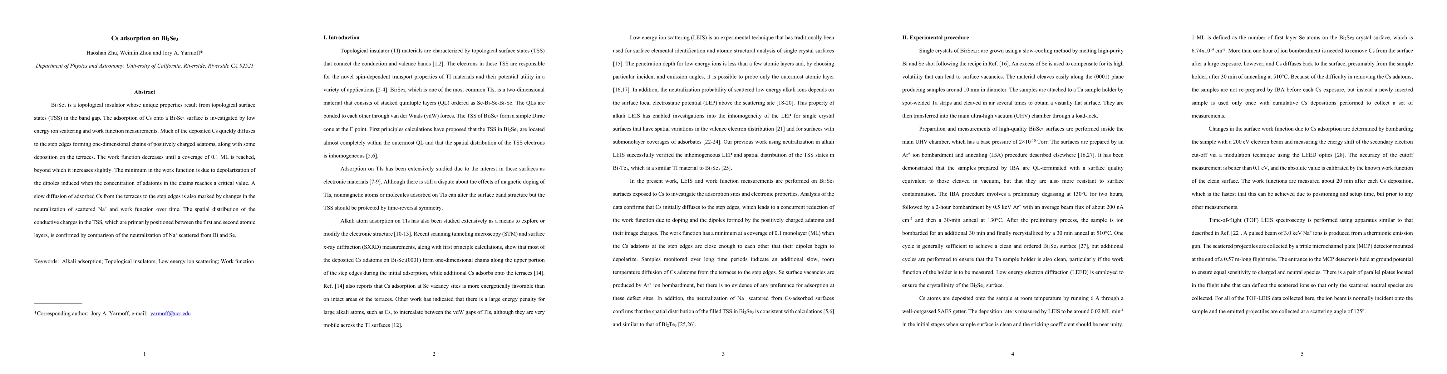 Bi$_2$Se$_3$ is a topological insulator whose unique properties result from topological surface states (TSS) in the band gap. The adsorption of Cs onto a Bi$_2$Se$_3$ surface is investigated by low energy ion scattering and work function measurements. Much of the deposited Cs quickly diffuses to the step edges forming one-dimensional chains of positively charged adatoms, along with some deposition on the terraces. The work function decreases until a coverage of 0.1 ML is reached, beyond which it increases slightly. The minimum in the work function is due to depolarization of the dipoles induced when the concentration of adatoms in the chains reaches a critical value. A slow diffusion of adsorbed Cs from the terraces to the step edges is also marked by changes in the neutralization of scattered Na$^+$ and work function over time. The spatial distribution of the conductive charges in the TSS, which are primarily positioned between the first and second atomic layers, is confirmed by comparison of the neutralization of Na$^+$ scattered from Bi and Se.