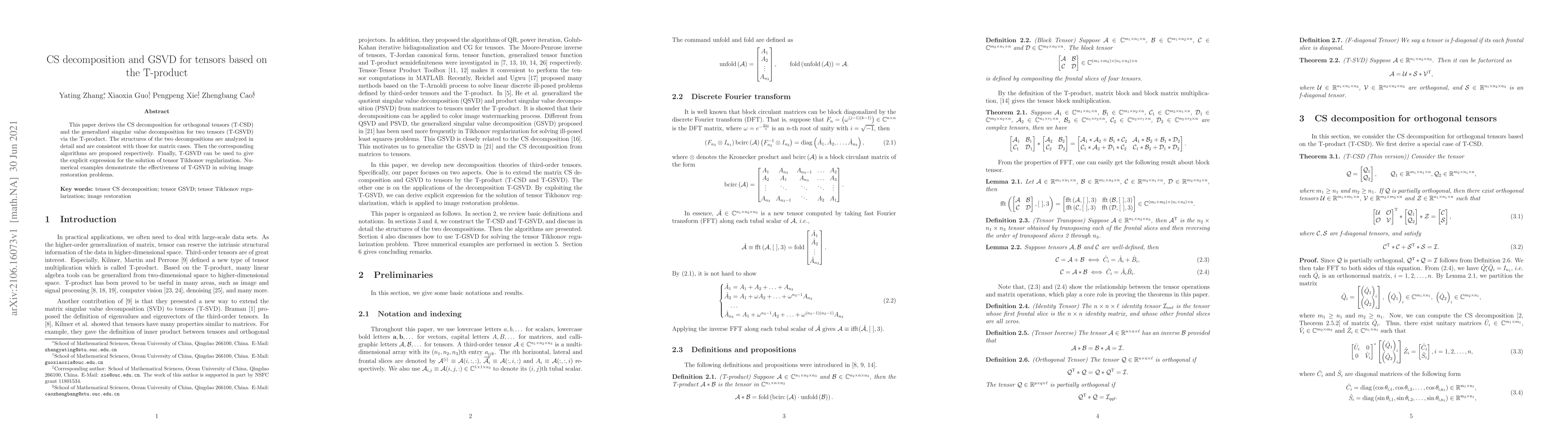 This paper introduces the CS decomposition (T-CSD) and generalized singular value decomposition (T-GSVD) for orthogonal tensors using the T-product, proposing corresponding algorithms and demonstrating T-GSVD's effectiveness in solving tensor Tikhonov regularization and image restoration problems.