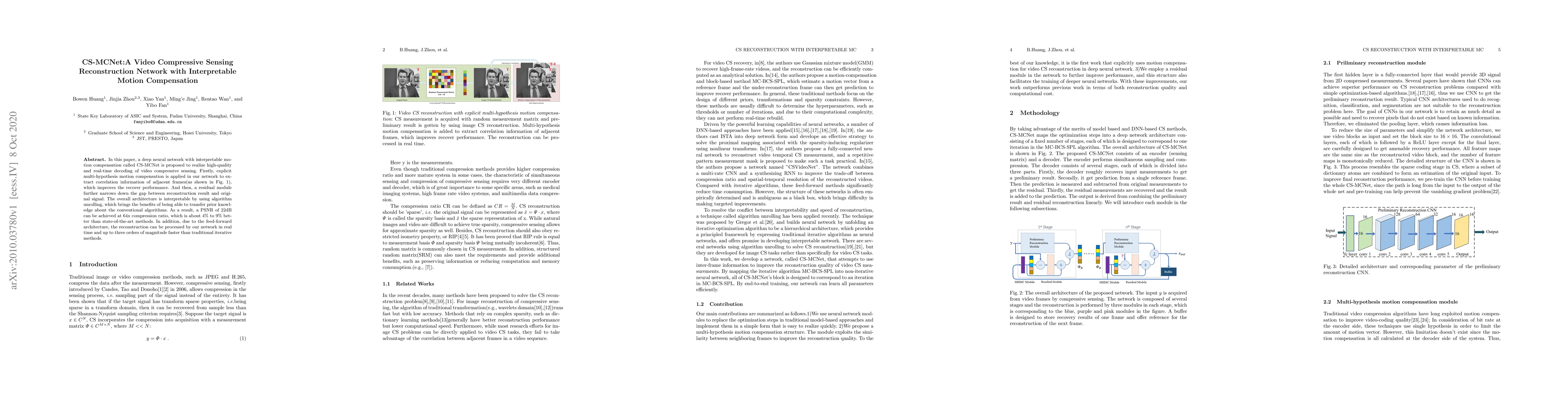 In this paper, a deep neural network with interpretable motion compensation called CS-MCNet is proposed to realize high-quality and real-time decoding of video compressive sensing. Firstly, explicit multi-hypothesis motion compensation is applied in our network to extract correlation information of adjacent frames(as shown in Fig. 1), which improves the recover performance. And then, a residual module further narrows down the gap between reconstruction result and original signal. The overall architecture is interpretable by using algorithm unrolling, which brings the benefits of being able to transfer prior knowledge about the conventional algorithms. As a result, a PSNR of 22dB can be achieved at 64x compression ratio, which is about 4% to 9% better than state-of-the-art methods. In addition, due to the feed-forward architecture, the reconstruction can be processed by our network in real time and up to three orders of magnitude faster than traditional iterative methods.