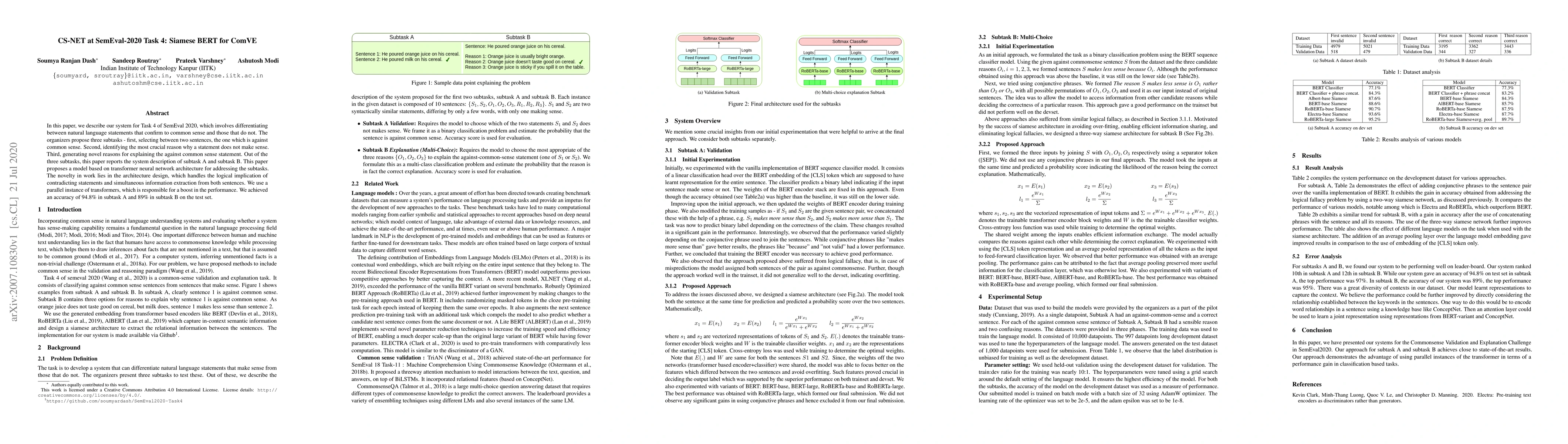 In this paper, we describe our system for Task 4 of SemEval 2020, which involves differentiating between natural language statements that confirm to common sense and those that do not. The organizers propose three subtasks - first, selecting between two sentences, the one which is against common sense. Second, identifying the most crucial reason why a statement does not make sense. Third, generating novel reasons for explaining the against common sense statement. Out of the three subtasks, this paper reports the system description of subtask A and subtask B. This paper proposes a model based on transformer neural network architecture for addressing the subtasks. The novelty in work lies in the architecture design, which handles the logical implication of contradicting statements and simultaneous information extraction from both sentences. We use a parallel instance of transformers, which is responsible for a boost in the performance. We achieved an accuracy of 94.8% in subtask A and 89% in subtask B on the test set.