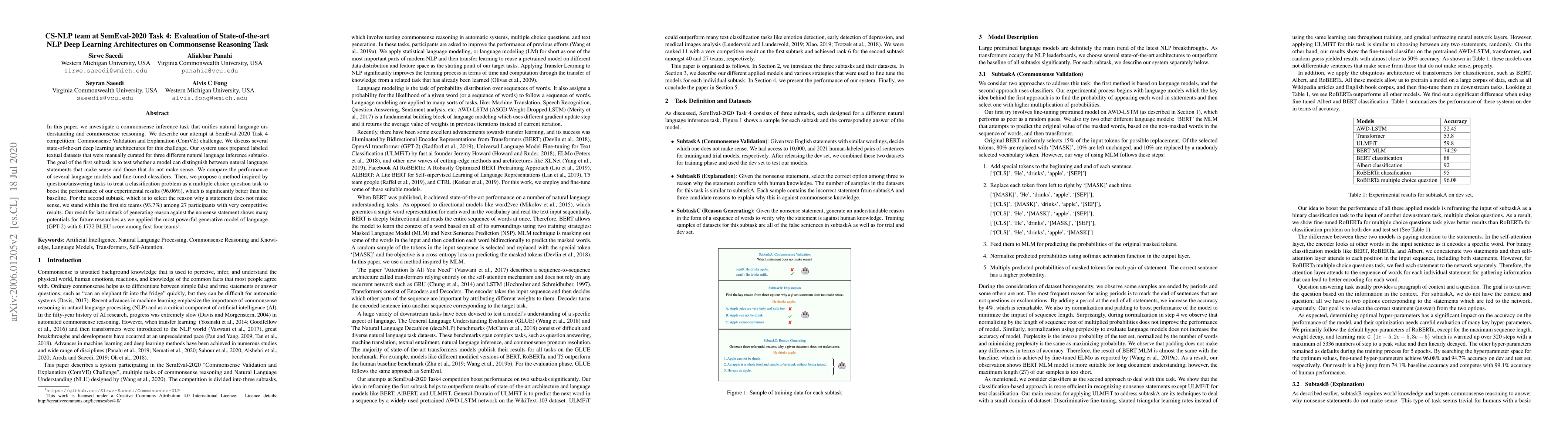 The CS-NLP team evaluated state-of-the-art deep learning architectures for a commonsense reasoning task at SemEval-2020, achieving top results in distinguishing sensible from nonsensical statements and selecting reasons for nonsensicality. They notably improved performance using a multiple-choice approach and generated reasons with GPT-2, achieving high BLEU scores.