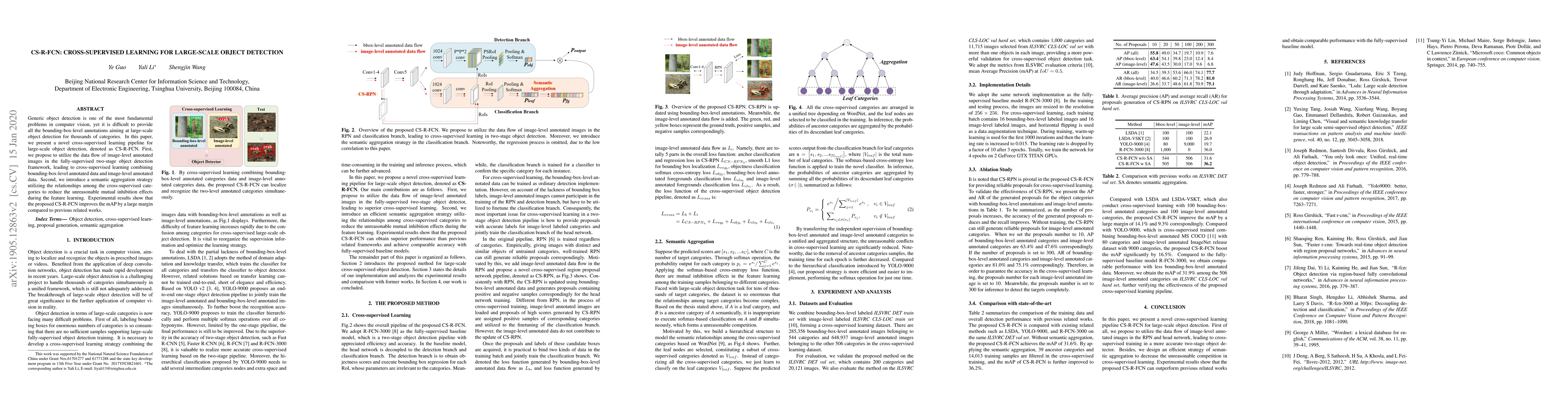 The paper introduces CS-R-FCN, a cross-supervised learning method for large-scale object detection, combining bounding-box and image-level annotations to enhance detection performance. The approach also employs semantic aggregation to mitigate mutual inhibition effects, achieving significant improvements in mean average precision (mAP) over previous methods.