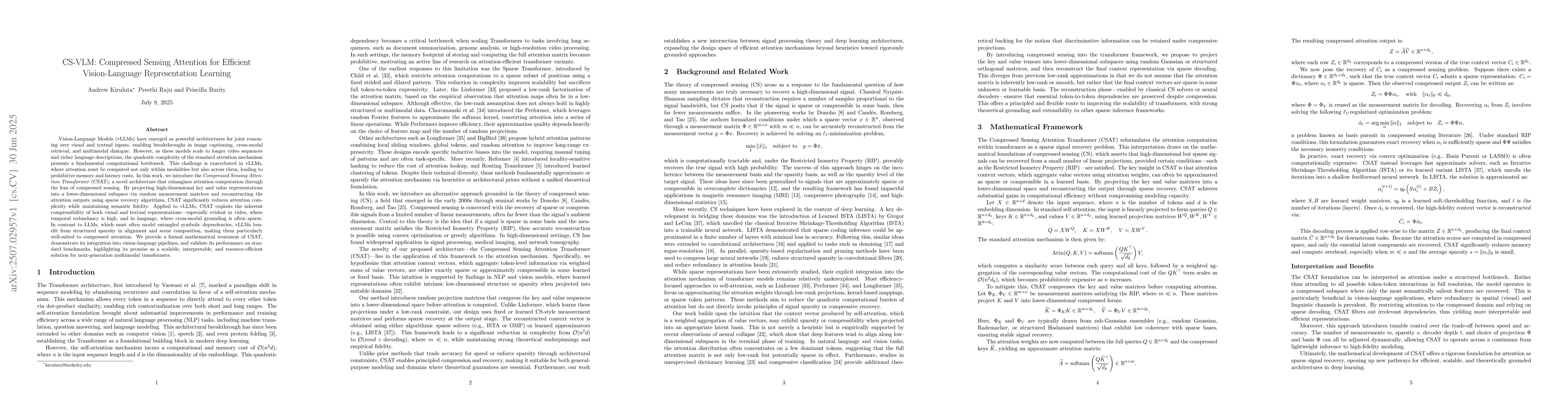 Vision-Language Models (vLLMs) have emerged as powerful architectures for joint reasoning over visual and textual inputs, enabling breakthroughs in image captioning, cross modal retrieval, and multimodal dialogue. However, as these models scale to longer video sequences and richer language descriptions, the quadratic complexity of the standard attention mechanism presents a fundamental computational bottleneck. This challenge is exacerbated in vLLMs, where attention must be computed not only within modalities but also across them, leading to prohibitive memory and latency costs. In this work, we introduce the Compressed Sensing Attention Transformer (CSAT), a novel architecture that reimagines attention computation through the lens of compressed sensing. By projecting high dimensional key and value representations into a lower-dimensional subspace via random measurement matrices and reconstructing the attention outputs using sparse recovery algorithms, CSAT significantly reduces attention complexity while maintaining semantic fidelity. Applied to vLLMs, CSAT exploits the inherent compressibility of both visual and textual representations especially evident in video, where temporal redundancy is high, and in language, where cross-modal grounding is often sparse. In contrast to LLMs, which must often model entangled symbolic dependencies, vLLMs benefit from structured sparsity in alignment and scene composition, making them particularly well-suited to compressed attention. We provide a formal mathematical treatment of CSAT, demonstrate its integration into vision language pipelines, and validate its performance on standard benchmarks, highlighting its promise as a scalable, interpretable, and resource efficient solution for next generation multimodal transformers.