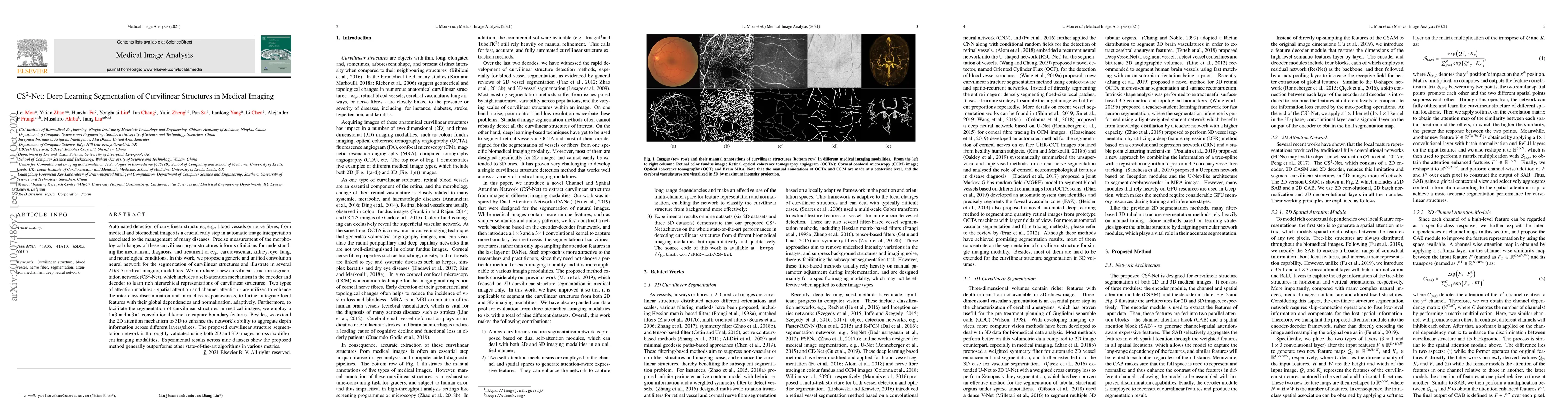 CS2-Net is a convolutional neural network designed for the precise segmentation of curvilinear structures in medical imaging, incorporating self-attention mechanisms and specialized convolutional kernels to enhance feature extraction and discrimination. The method is demonstrated across various 2D and 3D medical imaging modalities.