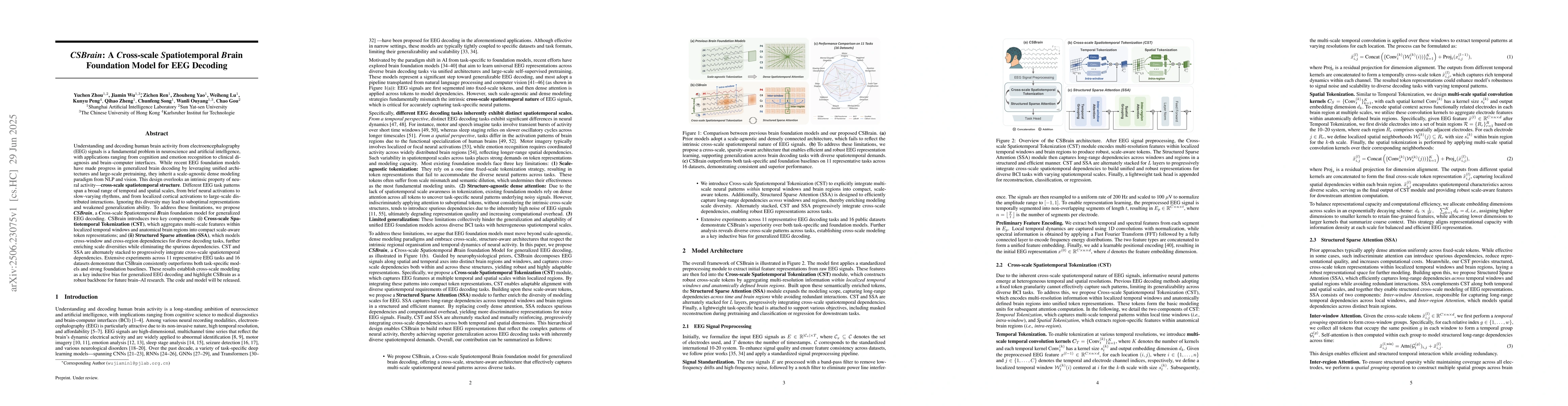 Understanding and decoding brain activity from electroencephalography (EEG) signals is a fundamental challenge in neuroscience and AI, with applications in cognition, emotion recognition, diagnosis, and brain-computer interfaces. While recent EEG foundation models advance generalized decoding via unified architectures and large-scale pretraining, they adopt a scale-agnostic dense modeling paradigm inherited from NLP and vision. This design neglects a core property of neural activity: cross-scale spatiotemporal structure. EEG task patterns span a wide range of temporal and spatial scales, from short bursts to slow rhythms, and from localized cortical responses to distributed interactions. Ignoring this diversity leads to suboptimal representations and weak generalization. We propose CSBrain, a Cross-scale Spatiotemporal Brain foundation model for generalized EEG decoding. CSBrain introduces: (i) Cross-scale Spatiotemporal Tokenization (CST), which aggregates multi-scale features from localized temporal windows and anatomical brain regions into compact scale-aware tokens; and (ii) Structured Sparse Attention (SSA), which captures cross-window and cross-region dependencies, enhancing scale diversity while removing spurious correlations. CST and SSA are alternately stacked to progressively integrate multi-scale dependencies. Experiments on 11 EEG tasks across 16 datasets show that CSBrain consistently outperforms task-specific and foundation model baselines. These results establish cross-scale modeling as a key inductive bias and position CSBrain as a robust backbone for future brain-AI research.
