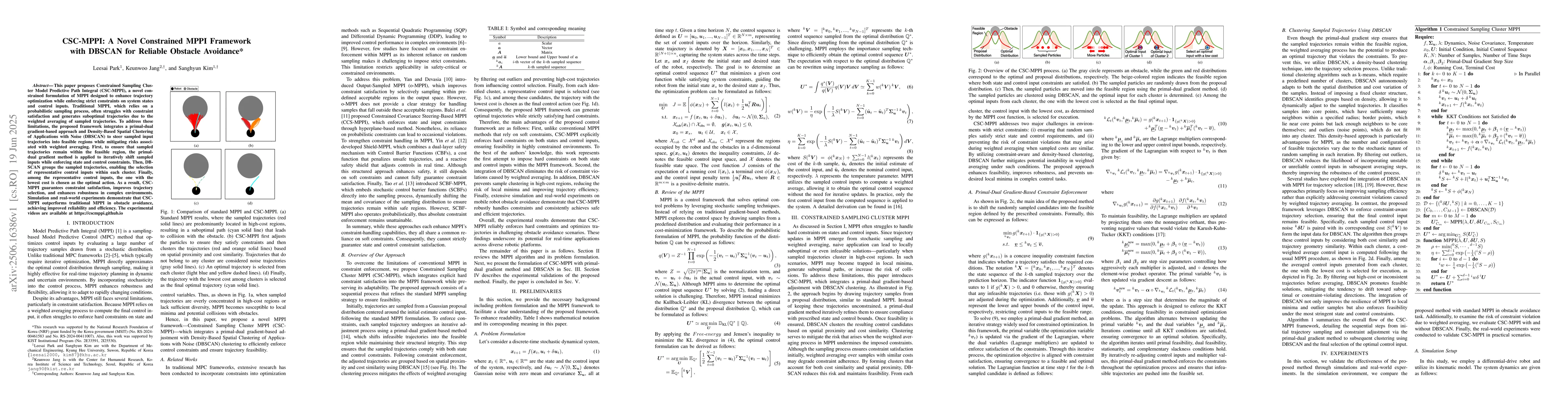 This paper proposes Constrained Sampling Cluster Model Predictive Path Integral (CSC-MPPI), a novel constrained formulation of MPPI designed to enhance trajectory optimization while enforcing strict constraints on system states and control inputs. Traditional MPPI, which relies on a probabilistic sampling process, often struggles with constraint satisfaction and generates suboptimal trajectories due to the weighted averaging of sampled trajectories. To address these limitations, the proposed framework integrates a primal-dual gradient-based approach and Density-Based Spatial Clustering of Applications with Noise (DBSCAN) to steer sampled input trajectories into feasible regions while mitigating risks associated with weighted averaging. First, to ensure that sampled trajectories remain within the feasible region, the primal-dual gradient method is applied to iteratively shift sampled inputs while enforcing state and control constraints. Then, DBSCAN groups the sampled trajectories, enabling the selection of representative control inputs within each cluster. Finally, among the representative control inputs, the one with the lowest cost is chosen as the optimal action. As a result, CSC-MPPI guarantees constraint satisfaction, improves trajectory selection, and enhances robustness in complex environments. Simulation and real-world experiments demonstrate that CSC-MPPI outperforms traditional MPPI in obstacle avoidance, achieving improved reliability and efficiency. The experimental videos are available at https://cscmppi.github.io