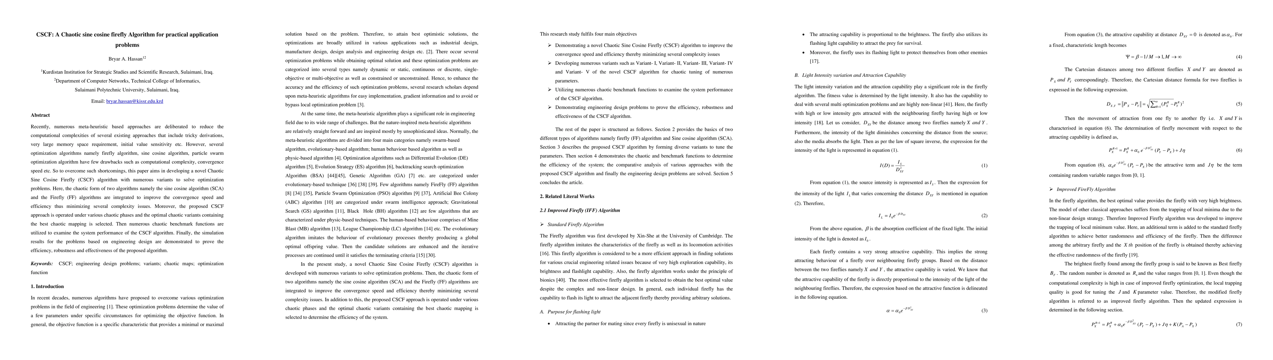 This paper introduces the Chaotic Sine Cosine Firefly (CSCF) algorithm, combining chaotic versions of the Sine Cosine and Firefly algorithms to enhance optimization efficiency and convergence speed, addressing computational complexity and initial value sensitivity issues. The proposed CSCF algorithm is tested on benchmark functions and engineering design problems to demonstrate its effectiveness.