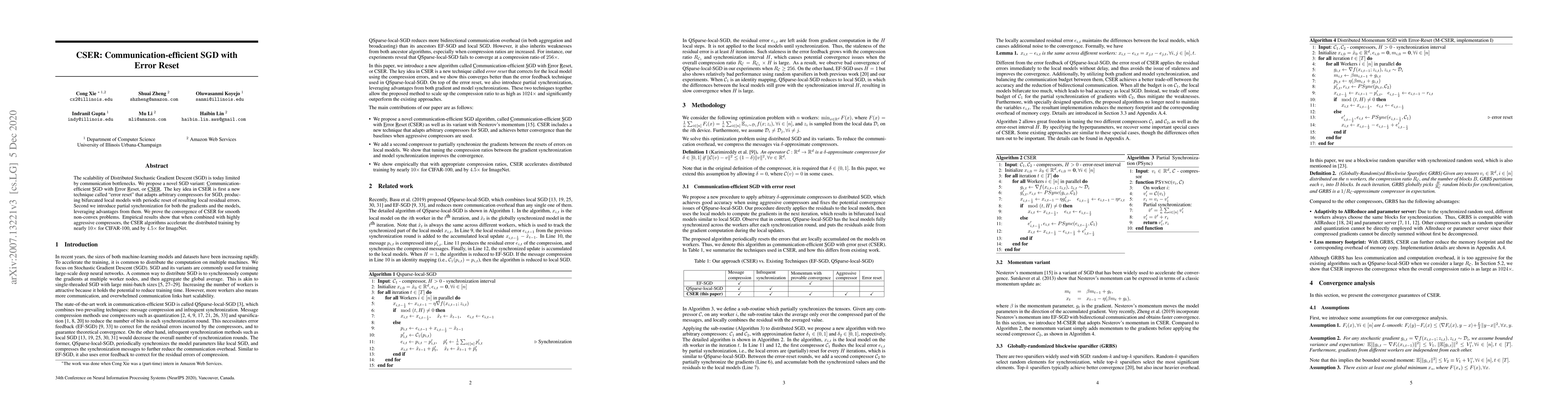 This paper introduces CSER, a communication-efficient variant of Distributed SGD that employs "error reset" to adapt compressors and uses partial synchronization for gradients and models, achieving nearly 10x speedup for CIFAR-100 and 4.5x for ImageNet. Theoretical convergence for smooth non-convex problems is also proven.