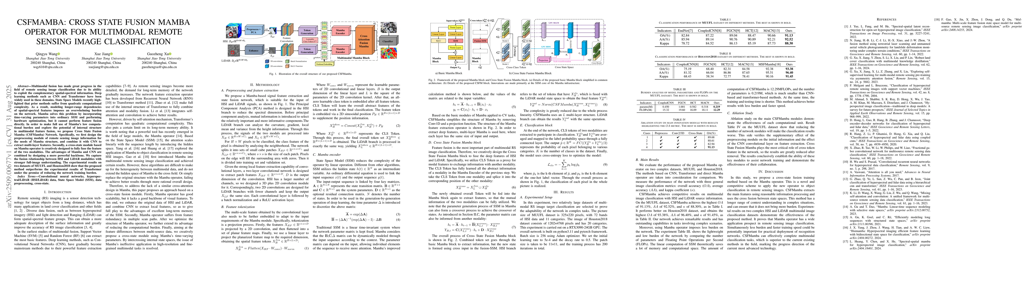 Multimodal fusion has made great progress in the field of remote sensing image classification due to its ability to exploit the complementary spatial-spectral information. Deep learning methods such as CNN and Transformer have been widely used in these domains. State Space Models recently highlighted that prior methods suffer from quadratic computational complexity. As a result, modeling longer-range dependencies of spatial-spectral features imposes an overwhelming burden on the network. Mamba solves this problem by incorporating time-varying parameters into ordinary SSM and performing hardware optimization, but it cannot perform feature fusion directly. In order to make full use of Mamba's low computational burden and explore the potential of internal structure in multimodal feature fusion, we propose Cross State Fusion Mamba (CSFMamba) Network. Specifically, we first design the preprocessing module of remote sensing image information for the needs of Mamba structure, and combine it with CNN to extract multi-layer features. Secondly, a cross-state module based on Mamba operator is creatively designed to fully fuse the feature of the two modalities. The advantages of Mamba and CNN are combined by designing a more powerful backbone. We capture the fusion relationship between HSI and LiDAR modalities with stronger full-image understanding. The experimental results on two datasets of MUUFL and Houston2018 show that the proposed method outperforms the experimental results of Transformer under the premise of reducing the network training burden.