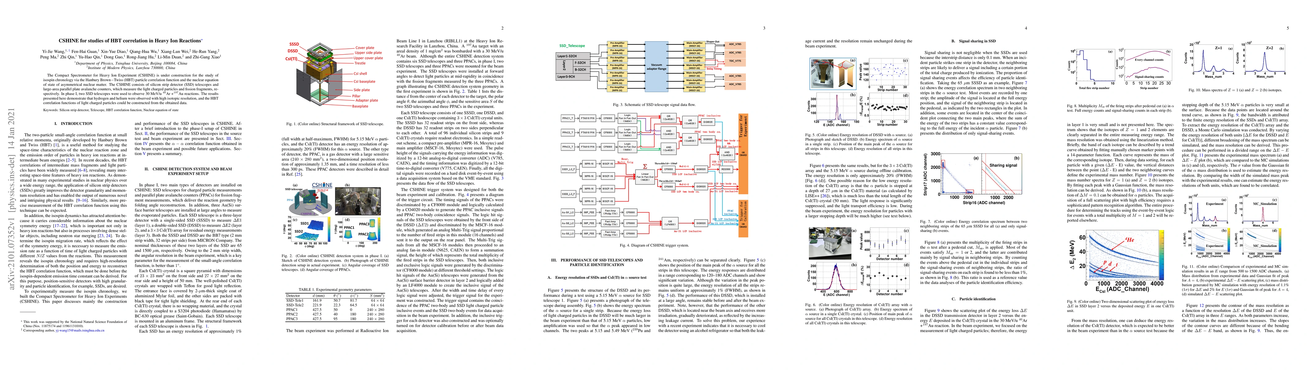 The CSHINE spectrometer, designed for heavy ion experiments, utilizes silicon strip detectors and avalanche counters to study isospin chronology and the nuclear equation of state via HBT correlation functions. Initial phase I results from $^{40}$Ar + $^{197}$Au reactions at 30 MeV/u show high isotopic resolution of hydrogen and helium and successful construction of HBT correlation functions.