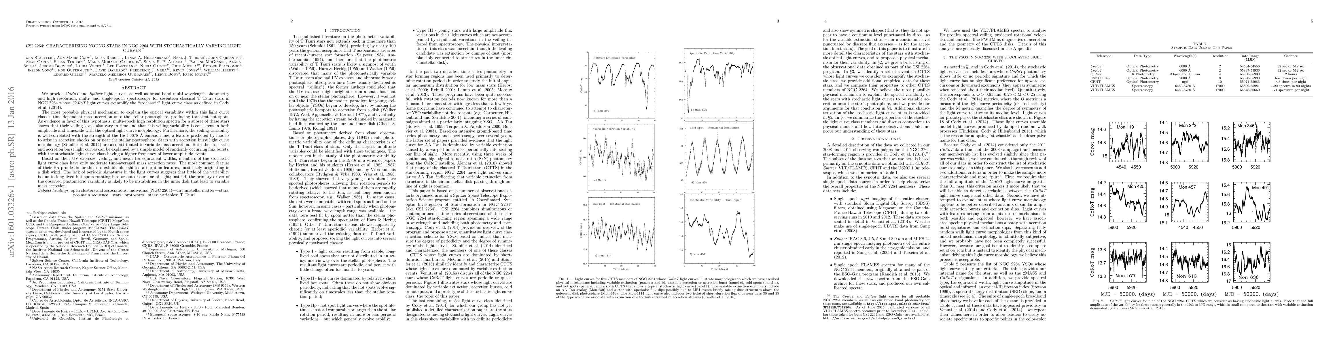 This study characterizes young stars in NGC 2264 using CoRoT and Spitzer light curves, revealing stochastic optical variability likely due to time-dependent mass accretion. The variability correlates with changes in veiling and HeI emission, supporting the hypothesis of accretion-driven transient hot spots.