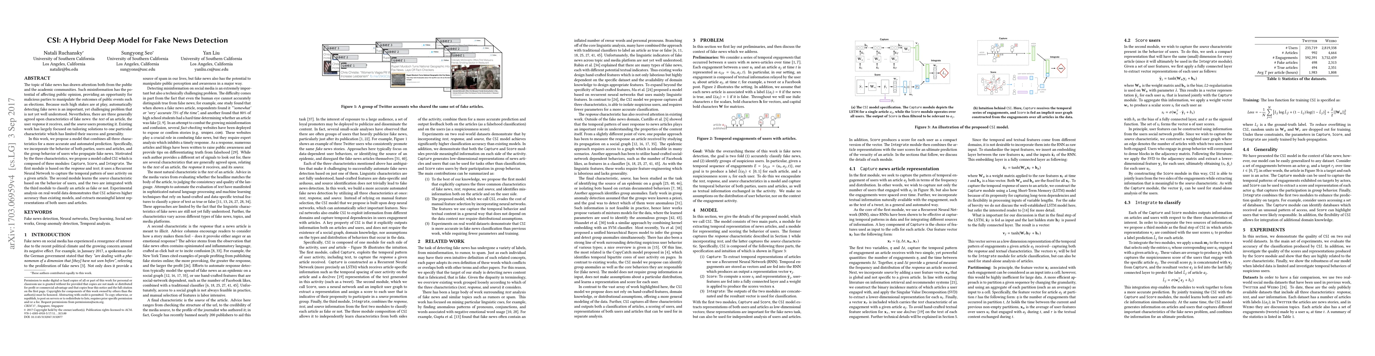 Researchers propose a hybrid deep model called CSI that combines user behavior, article text, and source characteristics to accurately detect fake news, outperforming existing models in real-world experiments.