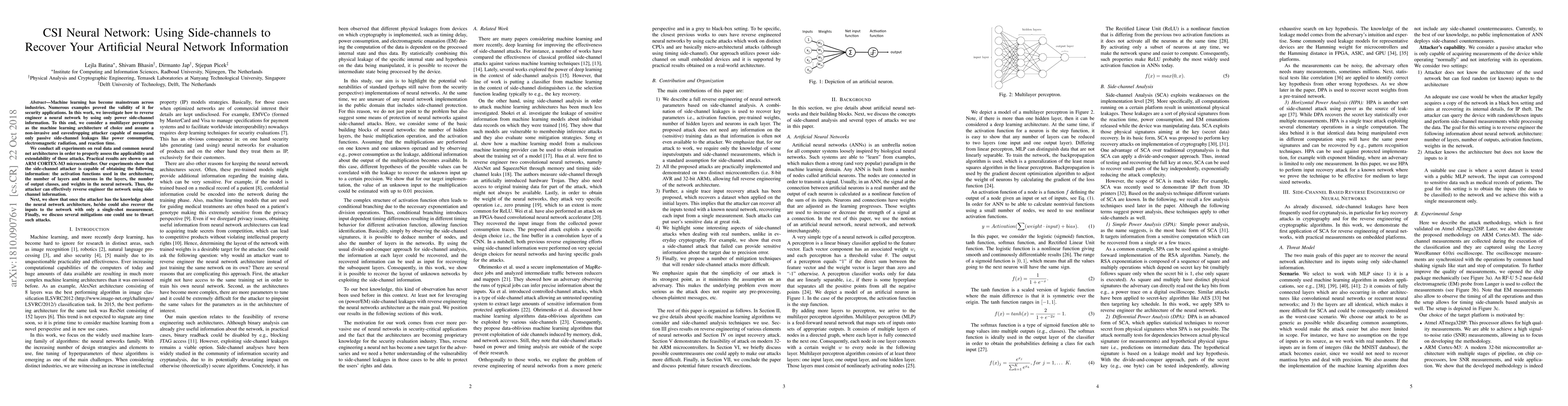This paper explores how side-channel information, such as power consumption and electromagnetic radiation, can be used to reverse engineer a neural network's architecture and weights. Experiments demonstrate that an attacker can recover the network's structure and inputs, highlighting the need for effective countermeasures.