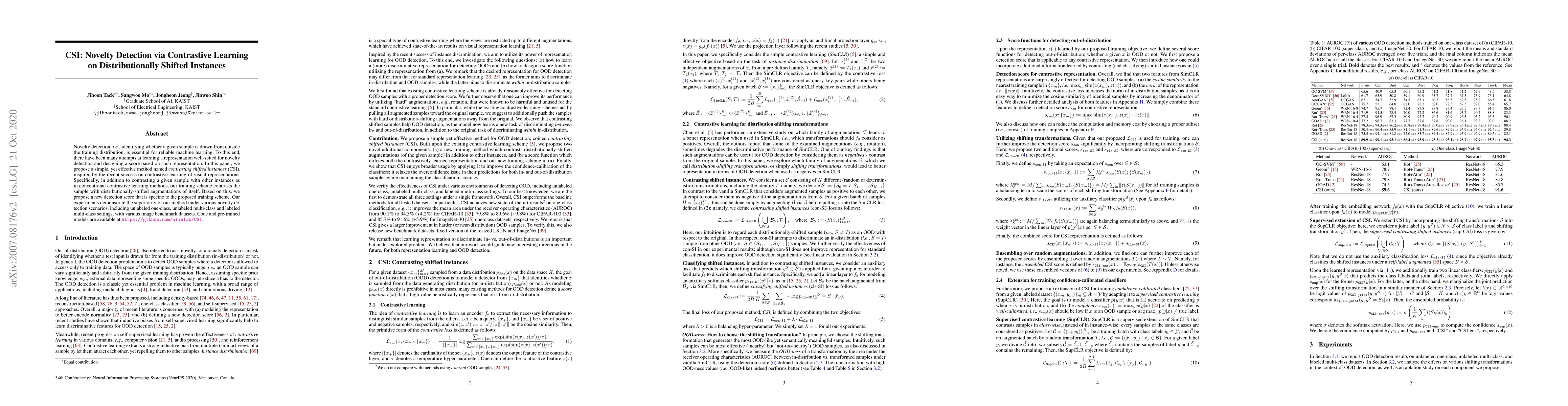 This paper introduces CSI, a novel method for novelty detection using contrastive learning on distributionally shifted instances, which contrasts samples with their own augmented versions. The proposed detection score is shown to outperform existing methods across various settings and datasets.
