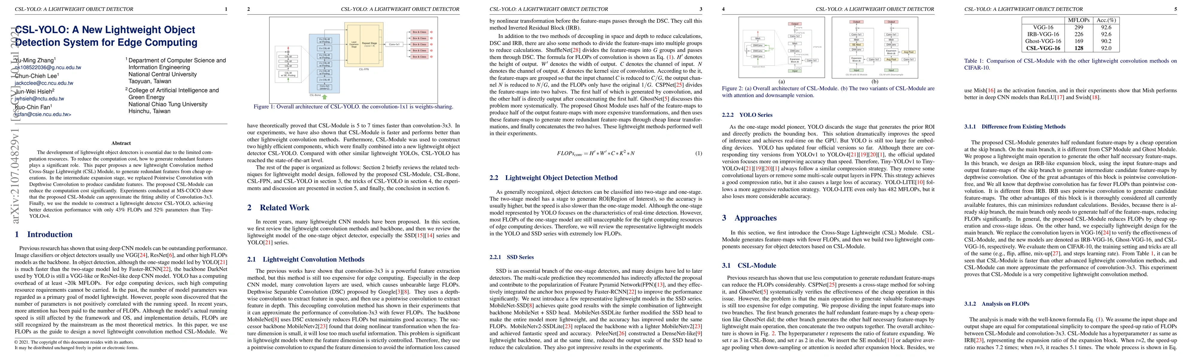 The paper introduces CSL-YOLO, a lightweight object detection system for edge computing. It proposes a new CSL Module using Depthwise Convolution for generating redundant features, reducing computation cost significantly. Experiments show CSL-Module approximates Convolution-3x3's fitting ability and, when used in CSL-YOLO, achieves better detection performance with 43% fewer FLOPs and 52% fewer parameters than Tiny-YOLOv4.