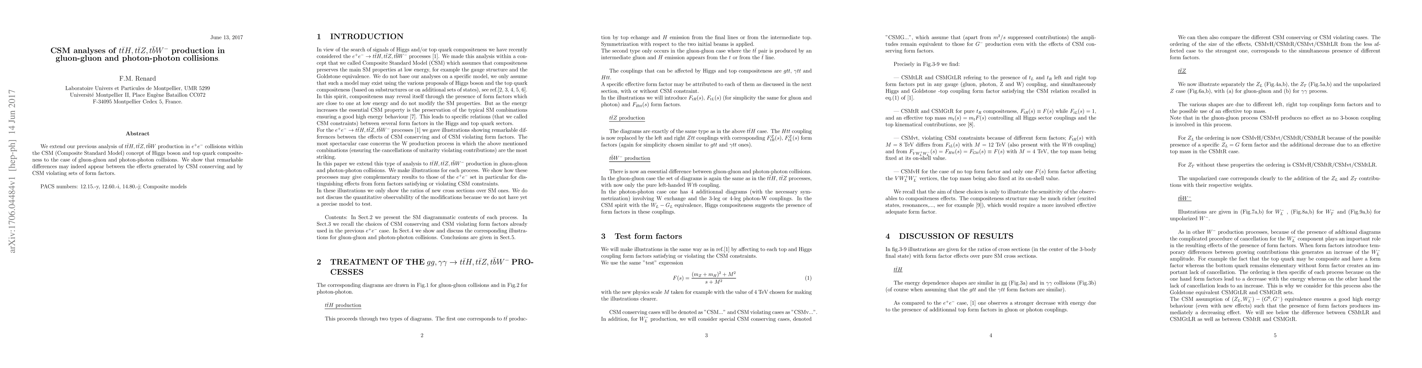 This paper extends the Composite Standard Model (CSM) analysis of $t\bar t H, t\bar t Z, t\bar b W$ production from $e^+e^-$ to gluon-gluon and photon-photon collisions, revealing significant differences in effects between CSM conserving and violating form factors.