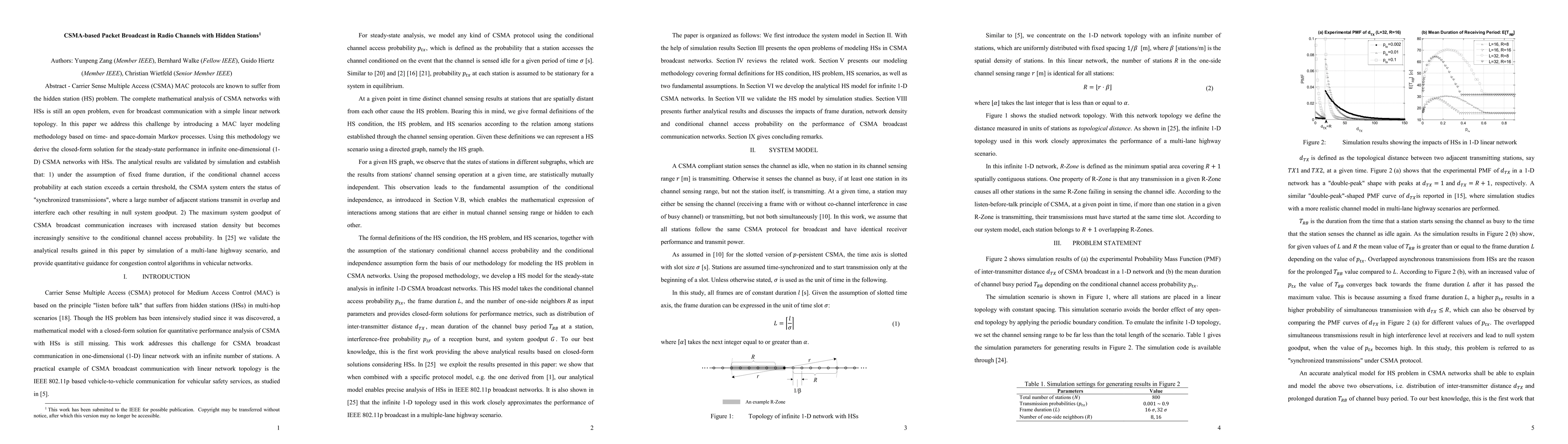 Carrier Sense Multiple Access (CSMA) MAC protocols are known to suffer from the hidden station (HS) problem. The complete mathematical analysis of CSMA networks with HSs is still an open problem, even for broadcast communication with a simple linear network topology. In this paper we address this challenge by introducing a MAC layer modeling methodology based on time- and space-domain Markov processes. Using this methodology we derive the closed-form solution for the steady-state performance in infinite one-dimensional (1-D) CSMA networks with HSs. The analytical results are validated by simulation and establish that: 1) under the assumption of fixed frame duration, if the conditional channel access probability at each station exceeds a certain threshold, the CSMA system enters the status of "synchronized transmissions", where a large number of adjacent stations transmit in overlap and interfere each other resulting in null system goodput. 2) The maximum system goodput of CSMA broadcast communication increases with increased station density but becomes increasingly sensitive to the conditional channel access probability. In [25] we validate the analytical results gained in this paper by simulation of a multi-lane highway scenario, and provide quantitative guidance for congestion control algorithms in vehicular networks.