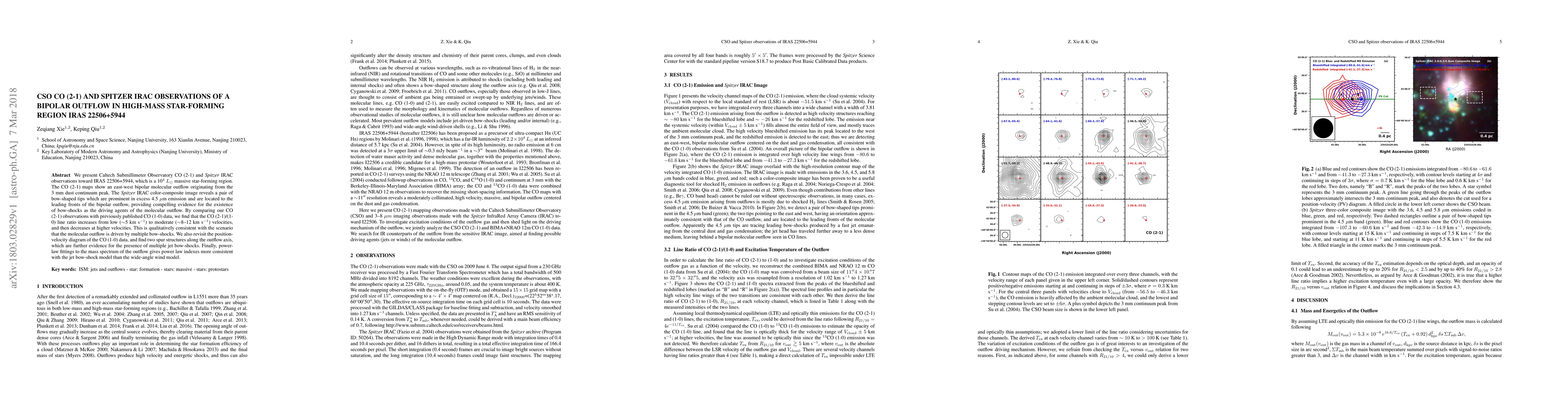 We present Caltech Submillimeter Observatory CO (2-1) and Spitzer IRAC observations toward IRAS 22506+5944, which is a 10$^4$ $L_{\odot}$ massive star-forming region. The CO (2-1) maps show an east-west bipolar molecular outflow originating from the 3 mm dust continuum peak. The Spitzer IRAC color-composite image reveals a pair of bow-shaped tips which are prominent in excess 4.5 $\mu$m emission and are located to the leading fronts of the bipolar outflow, providing compelling evidence for the existence of bow-shocks as the driving agents of the molecular outflow. By comparing our CO (2-1) observations with previously published CO (1-0) data, we find that the CO (2-1)/(1-0) line ratio increases from low (~5 km s$^{-1}$) to moderate (~8 - 12 km s$^{-1}$) velocities, and then decreases at higher velocities. This is qualitatively consistent with the scenario that the molecular outflow is driven by multiple bow-shocks. We also revisit the position-velocity diagram of the CO (1-0) data, and find two spur structures along the outflow axis, which are further evidence for the presence of multiple jet bow-shocks. Finally, power-law fittings to the mass spectrum of the outflow gives power law indexes more consistent with the jet bow-shock model than the wide-angle wind model.