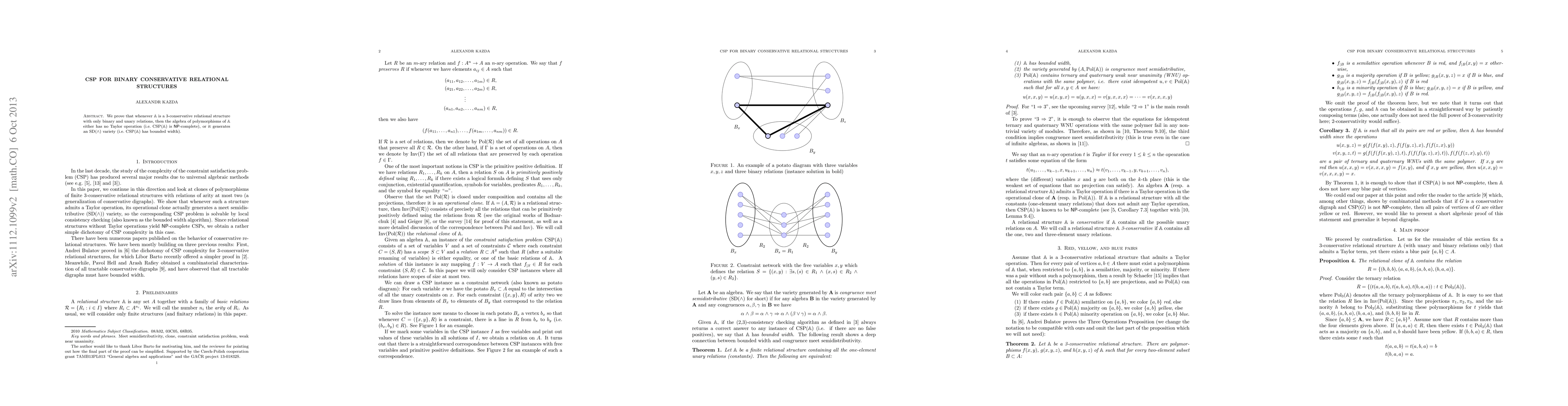 This paper demonstrates that for 3-conservative relational structures with binary and unary relations, the complexity of the constraint satisfaction problem (CSP) is either NP-complete or has bounded width, depending on the presence or absence of Taylor operations in the algebra of polymorphisms.